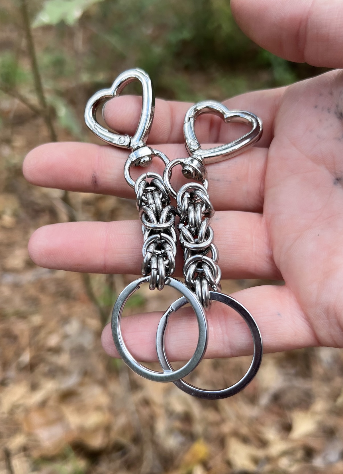 Stainless steel chainmaille with ring for keys, and a spring loaded heart belt clasp.