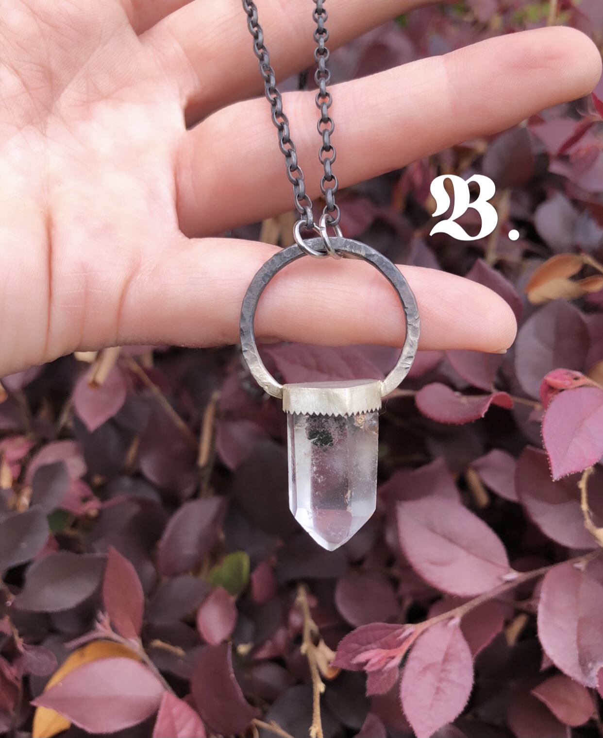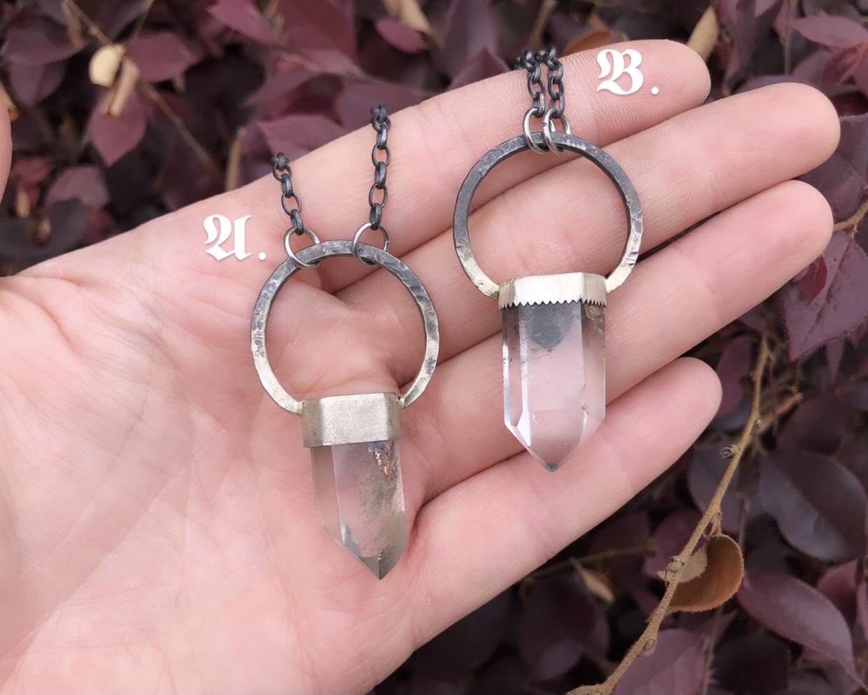Garden Quartz pendants with a sterling silver hammered hoop on a 17in’ oxidized silver chain.