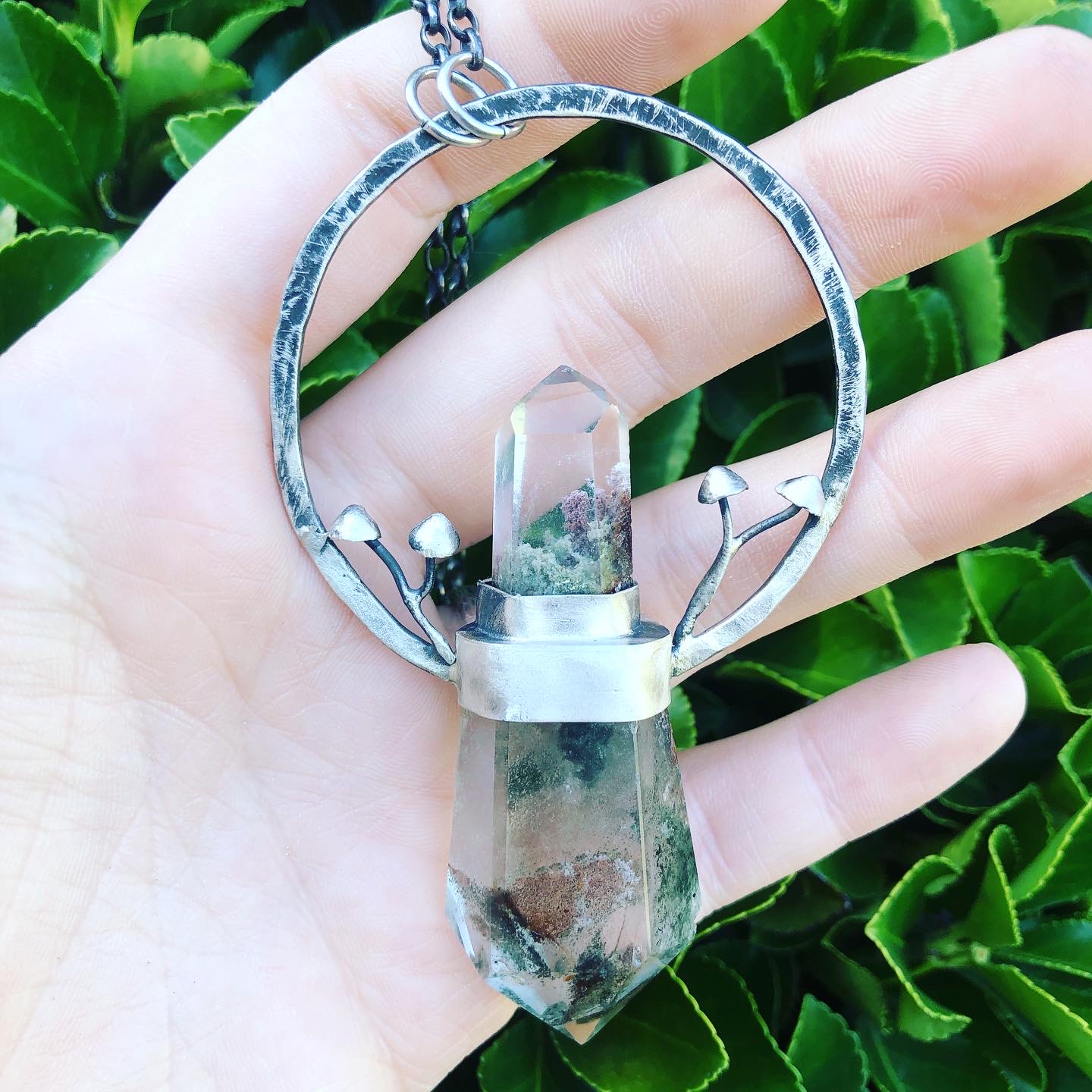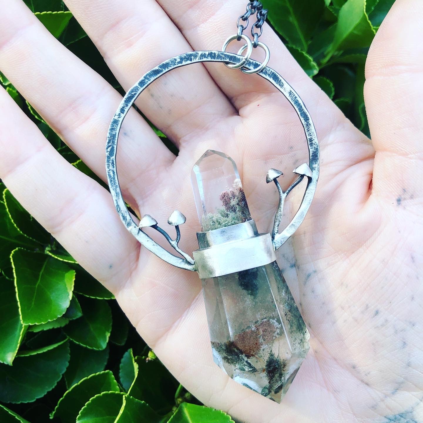 Double pointed quartz pendant featuring sterling silver mushrooms on a large hammered ring. Comes on a oxidized sterling silver chain.
