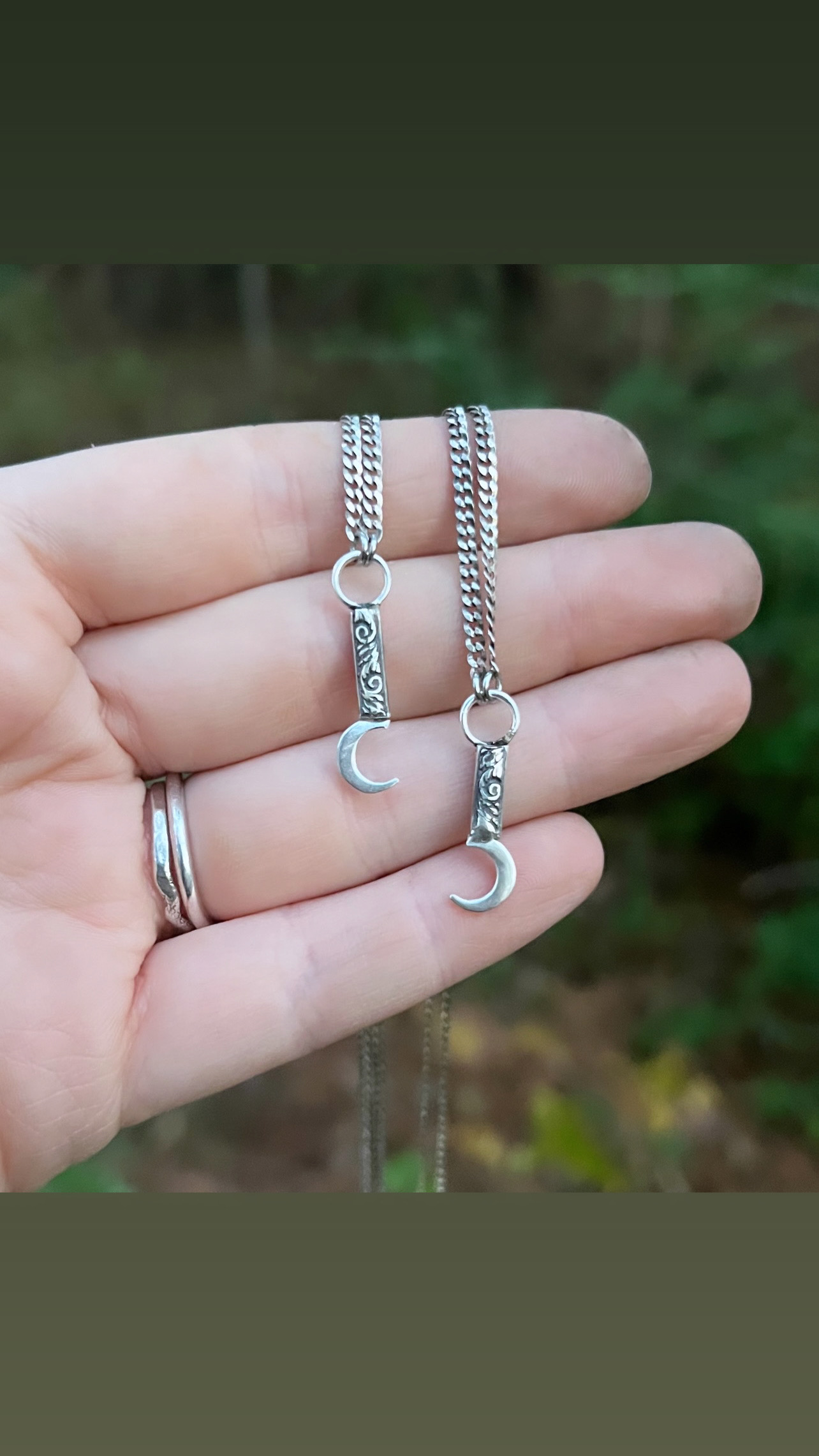 Hand fabricated hand scythe pendants on 18 inch chain, all sterling silver.