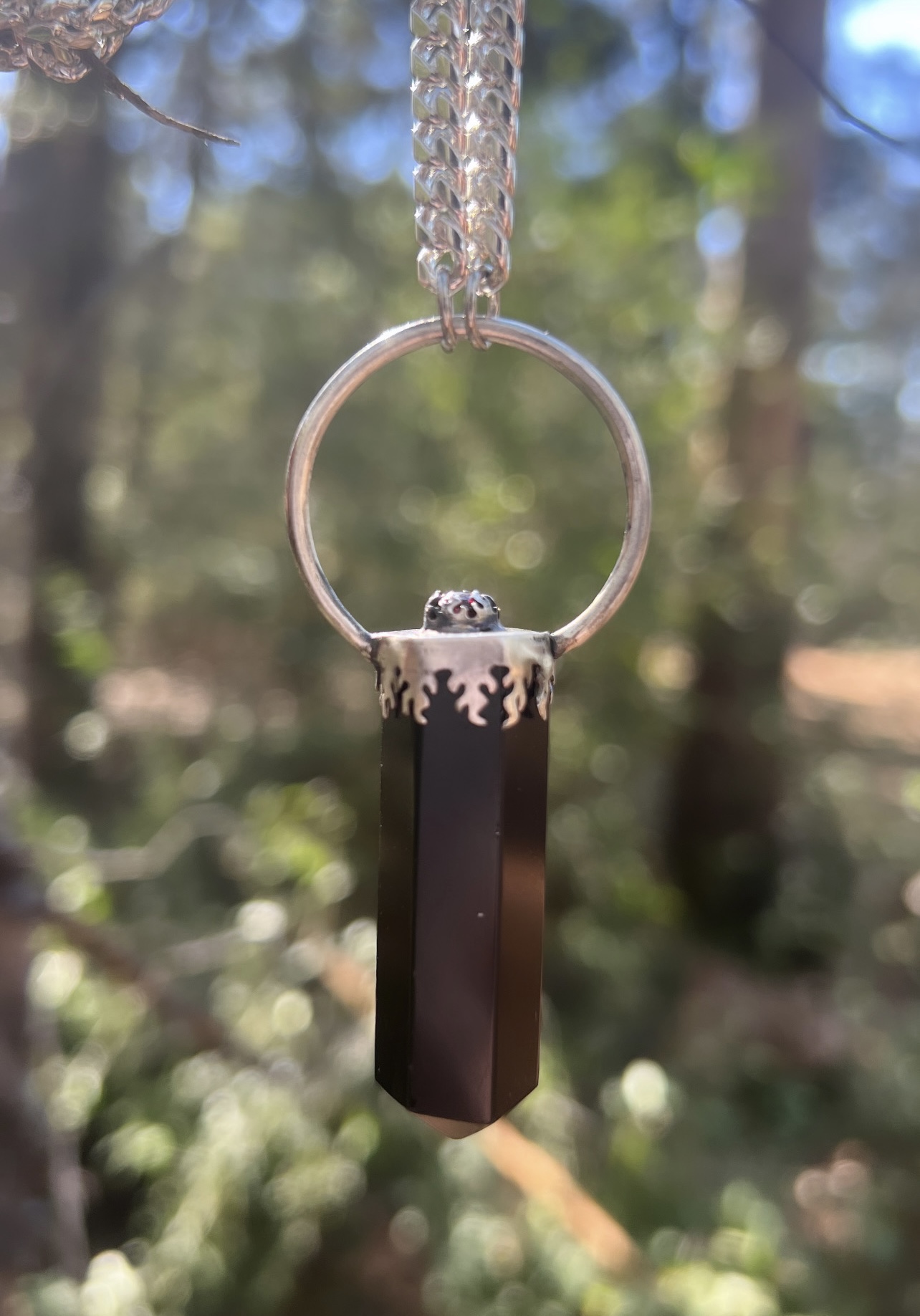 Sterling silver, black obsidian and garnet. On a large 16 inch cuban sterling silver chain.