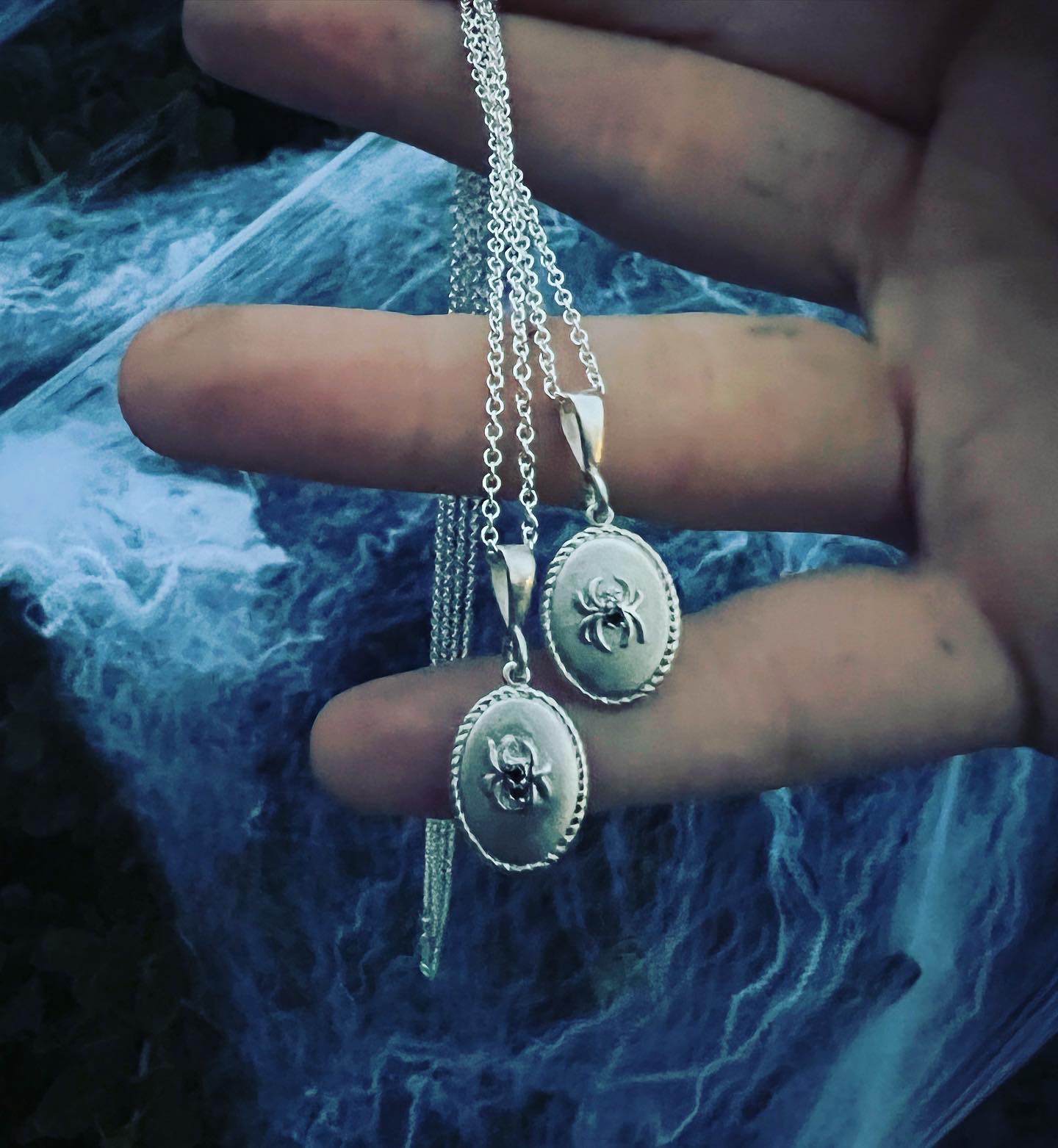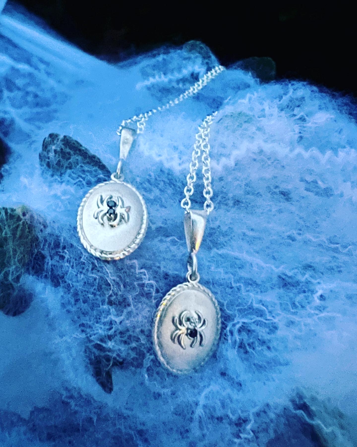 Sterling silver oval shaped pendants featuring spider charms with .01, and .02 carat ethically souced diamonds.