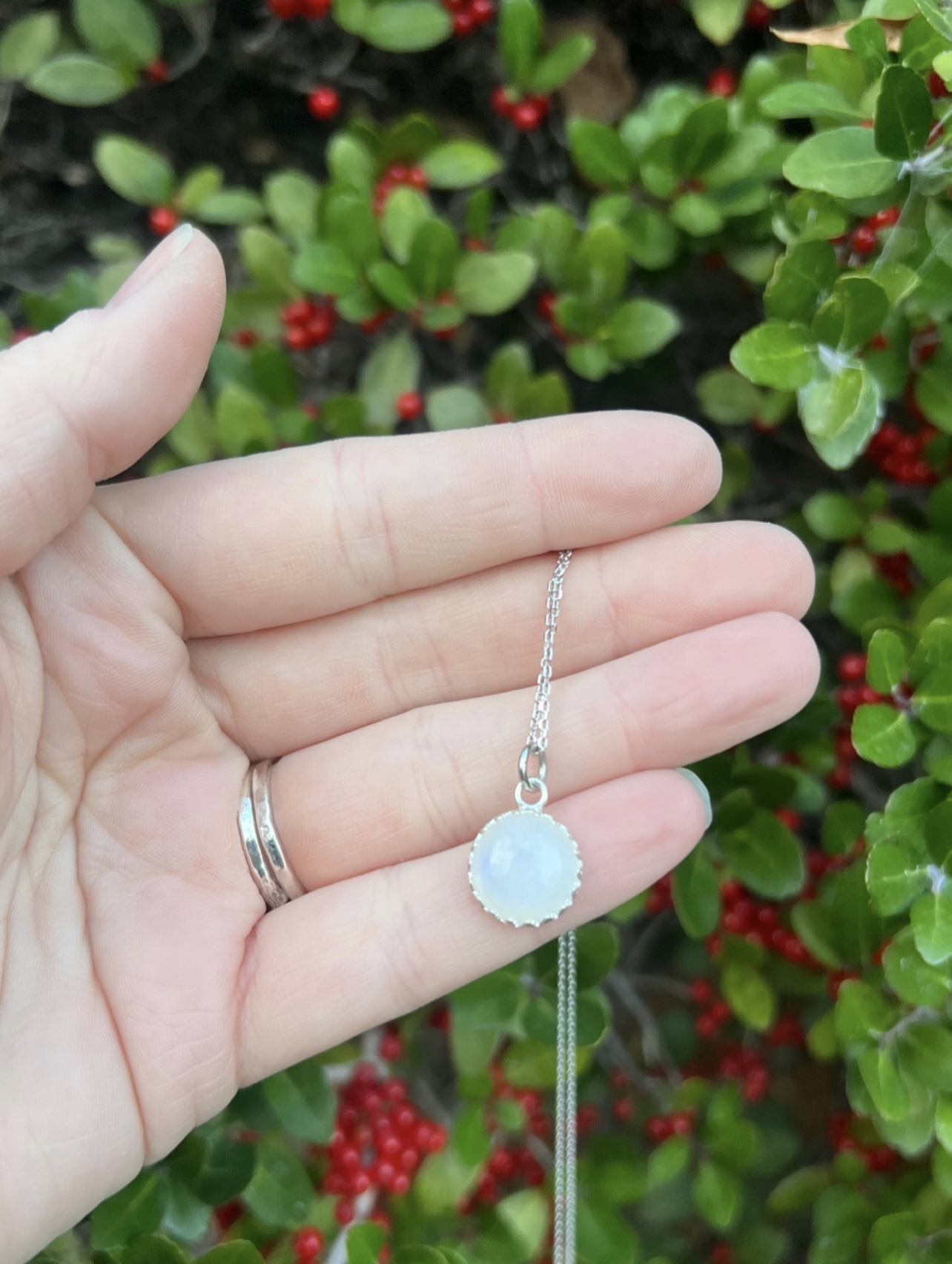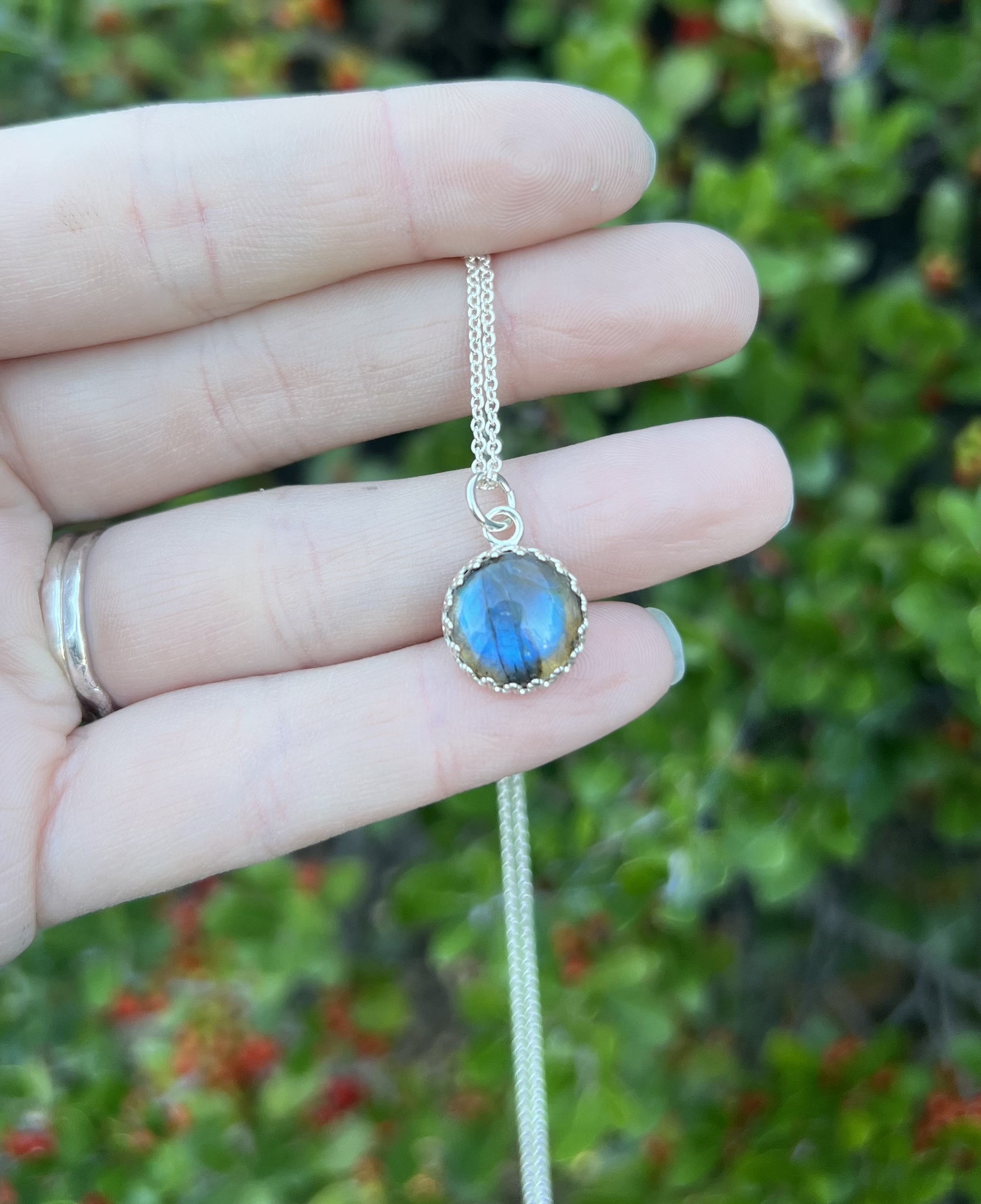 Labradorite stone set in a crown setting in a 18” sterling silver chain.