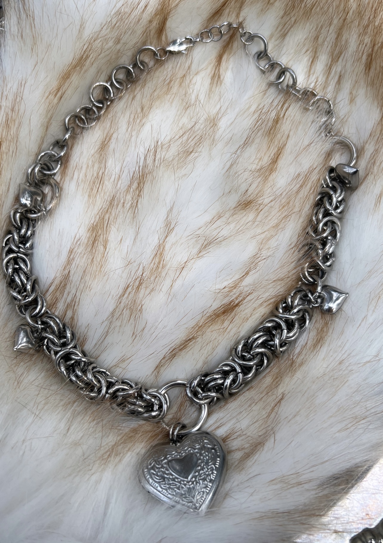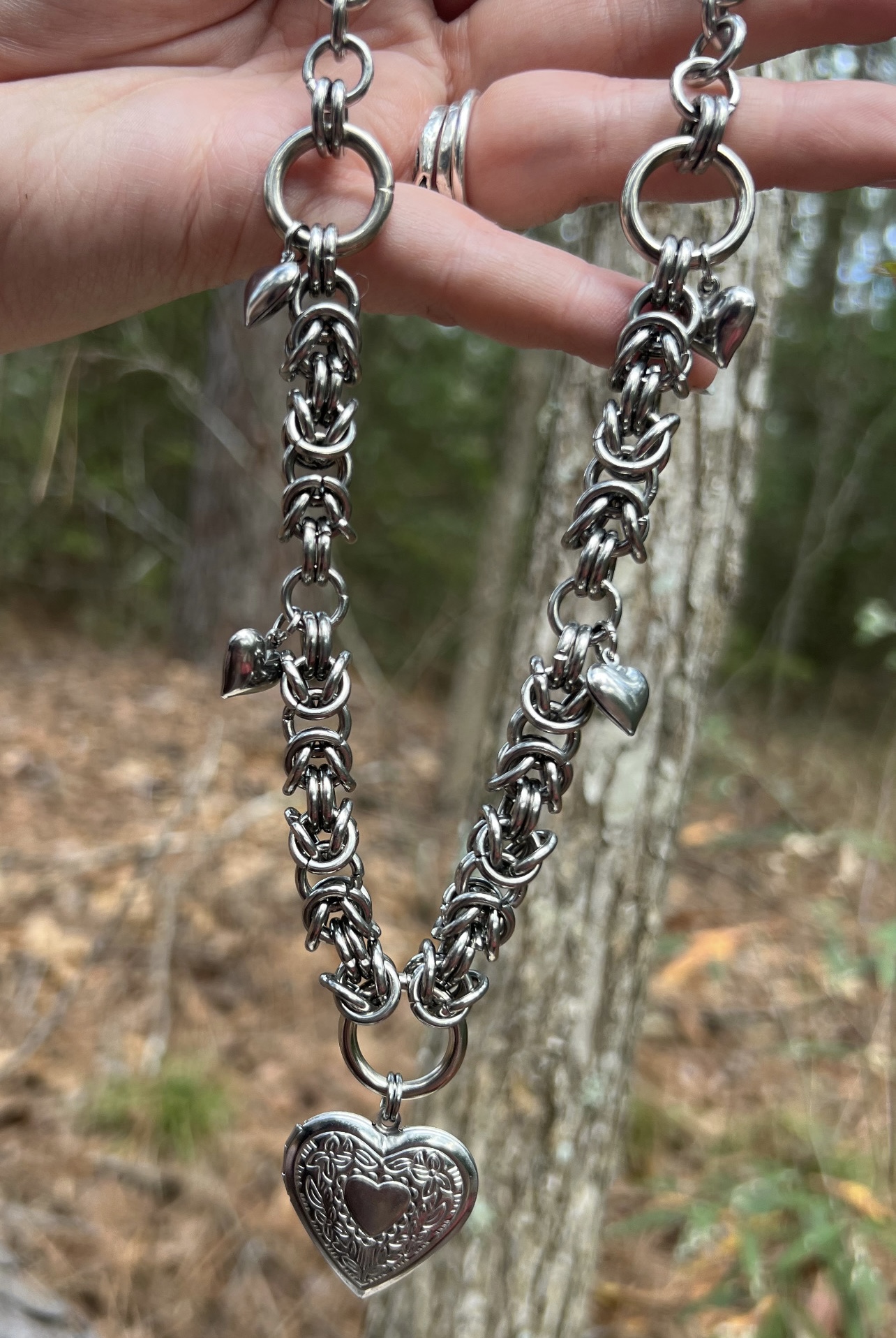 100% stainless steel chainmaille necklace with a large heart locket and small puffy heart charms.