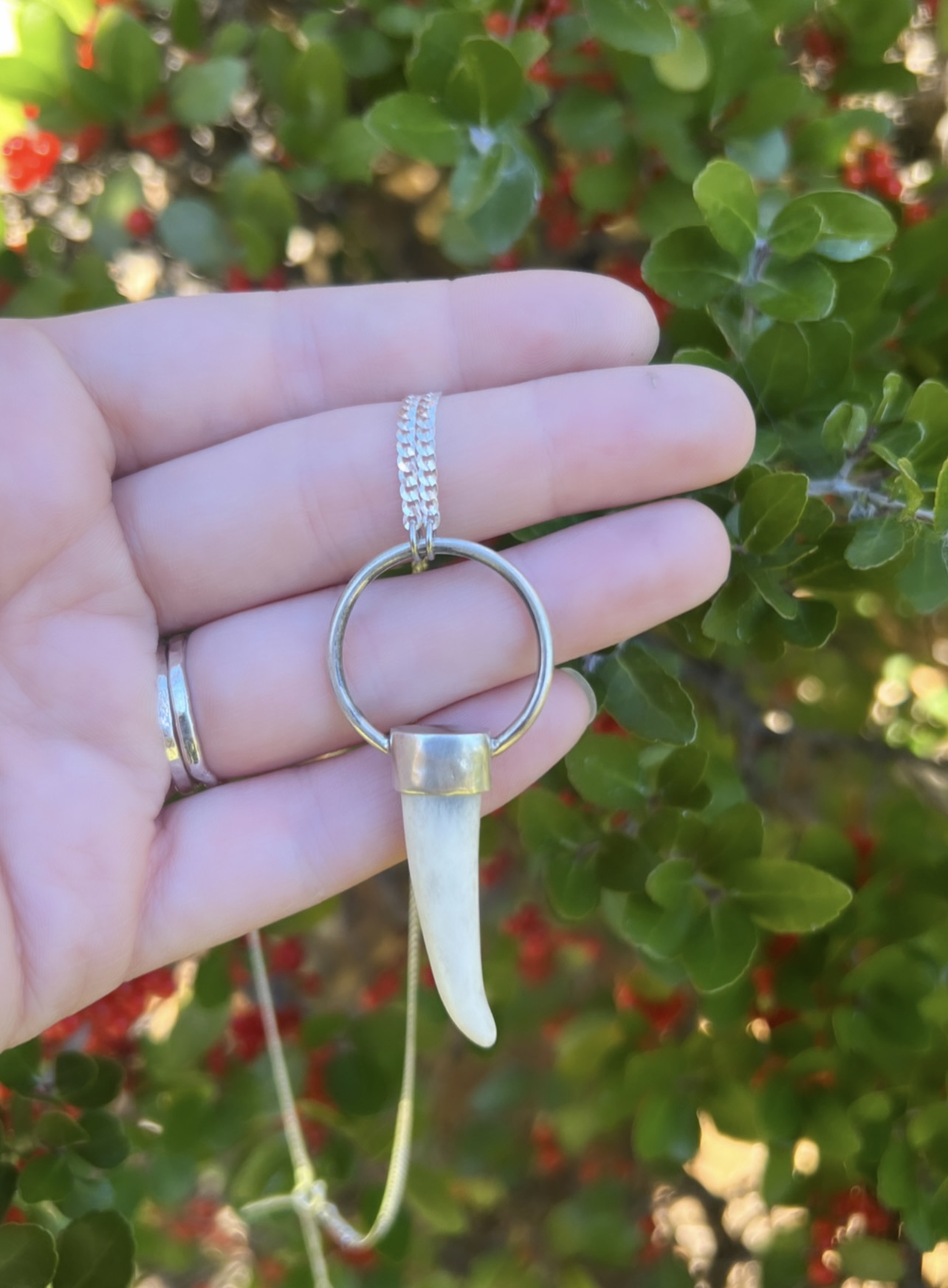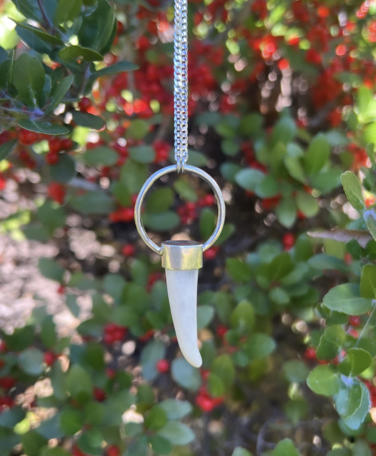 Sterling silver 1 inch hoop pendant with a se antler tip. On a 20 inch sterling silver curb chain.