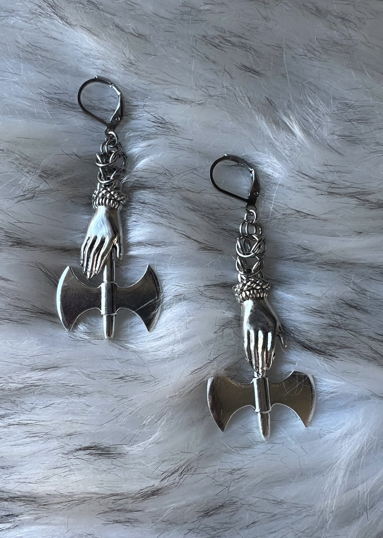 Silver plated hands grasping a sword, or an axe with chainmail.
