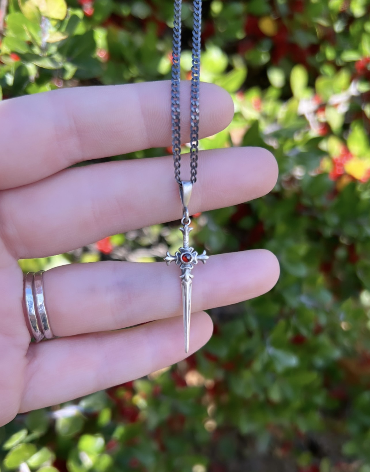 Sterling silver sword pendant with a bezel set garnet. On a 20 inch sterling silver oxidized Cuban chain.