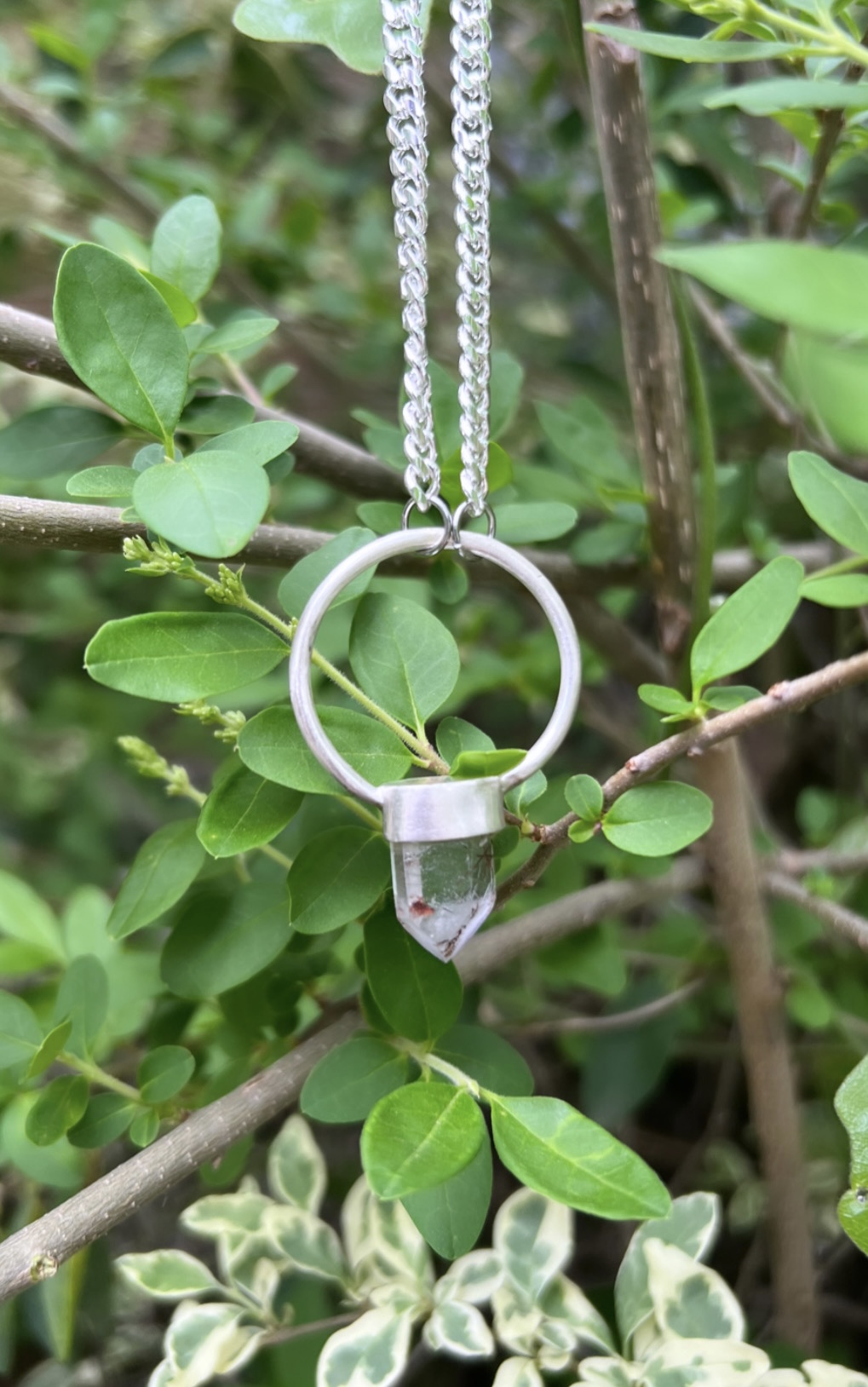 Small 1 inch sterling silver hoop with a bezel set Dendritic Quartz point crystal.