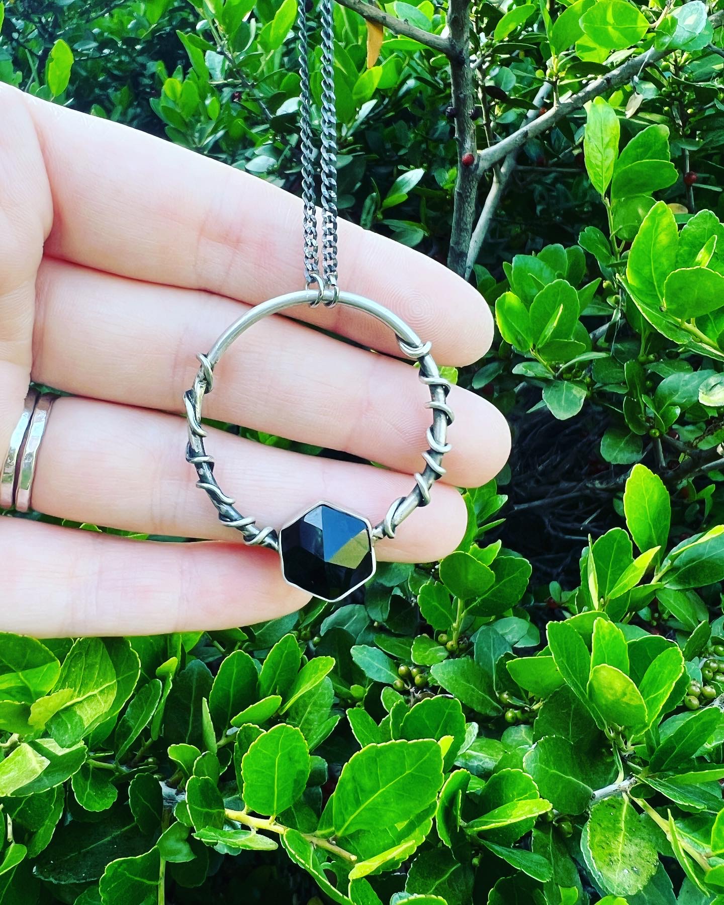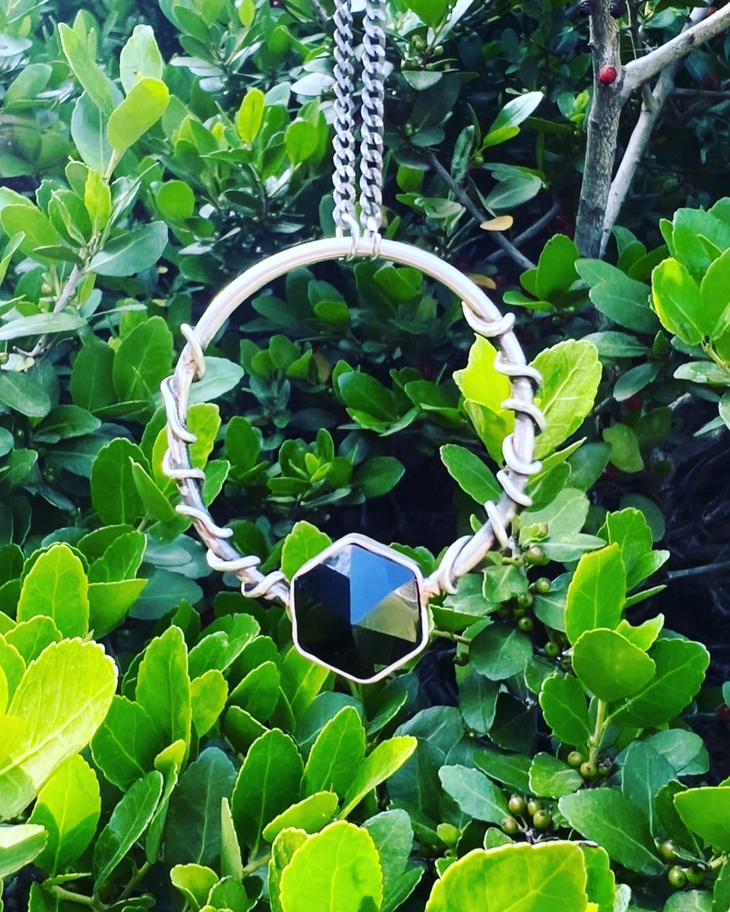 Black obsidian hexagon faceted stone set in all sterling silver bezel setting with a vine 2 inch hoop. On a 18 inch 2.5mm oxidized curb chain.