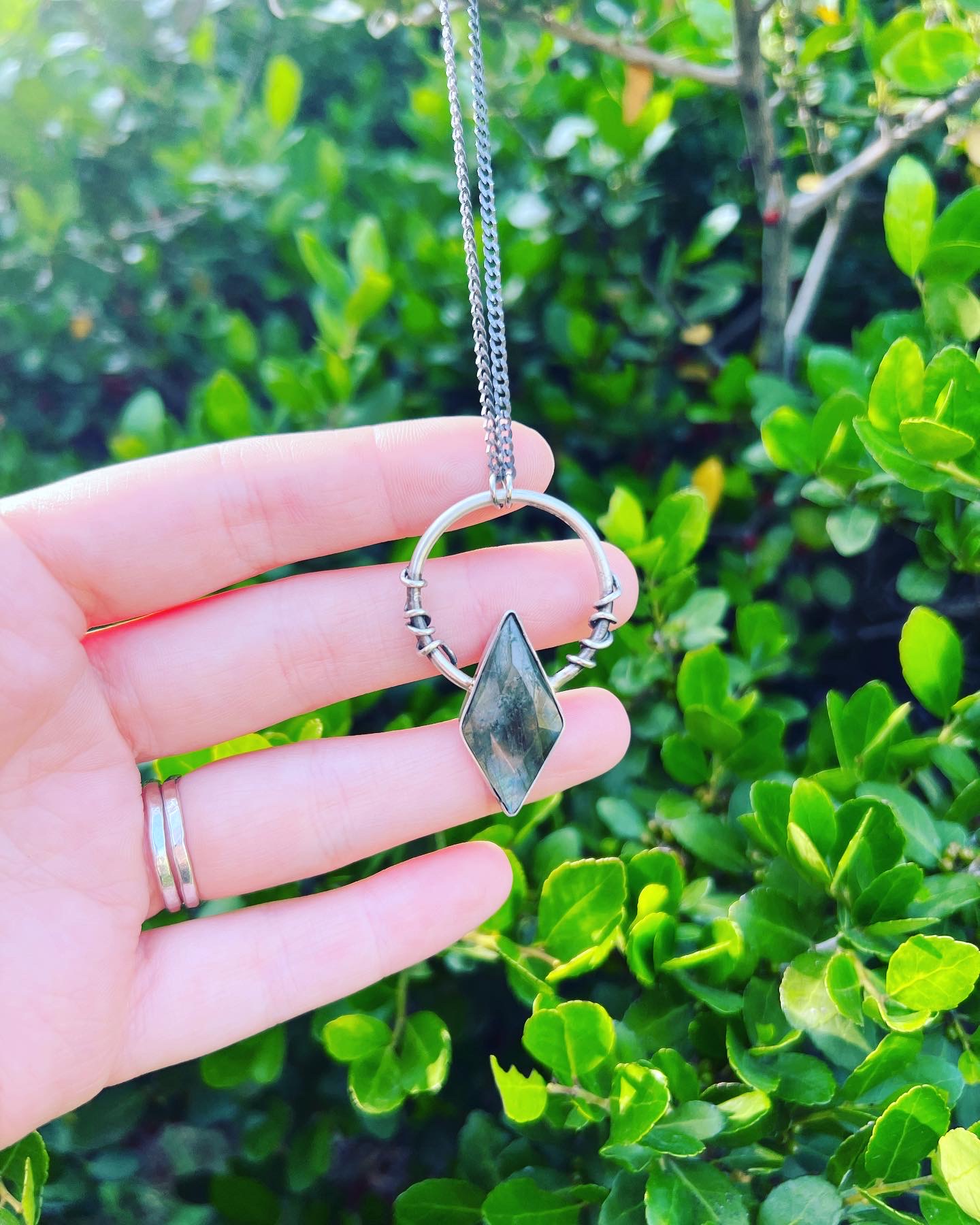 Kite labradorite faceted stone set in all sterling silver, 2 inch vine hoop on a 18 inch oxidized sterling silver curb chain.