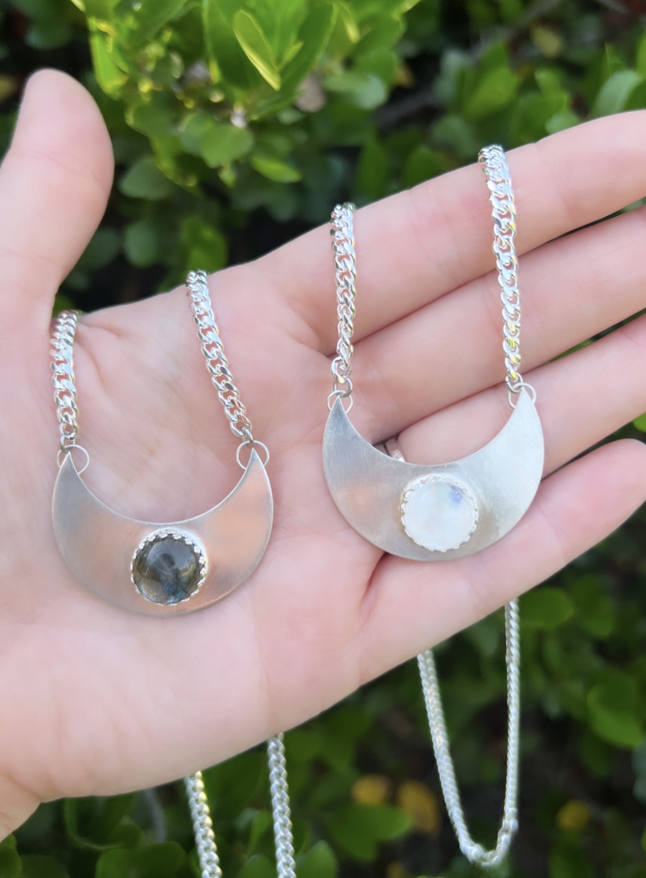 Large 2 inch sterling silver crescents set with moonstone or labradorite in a crown settings.
