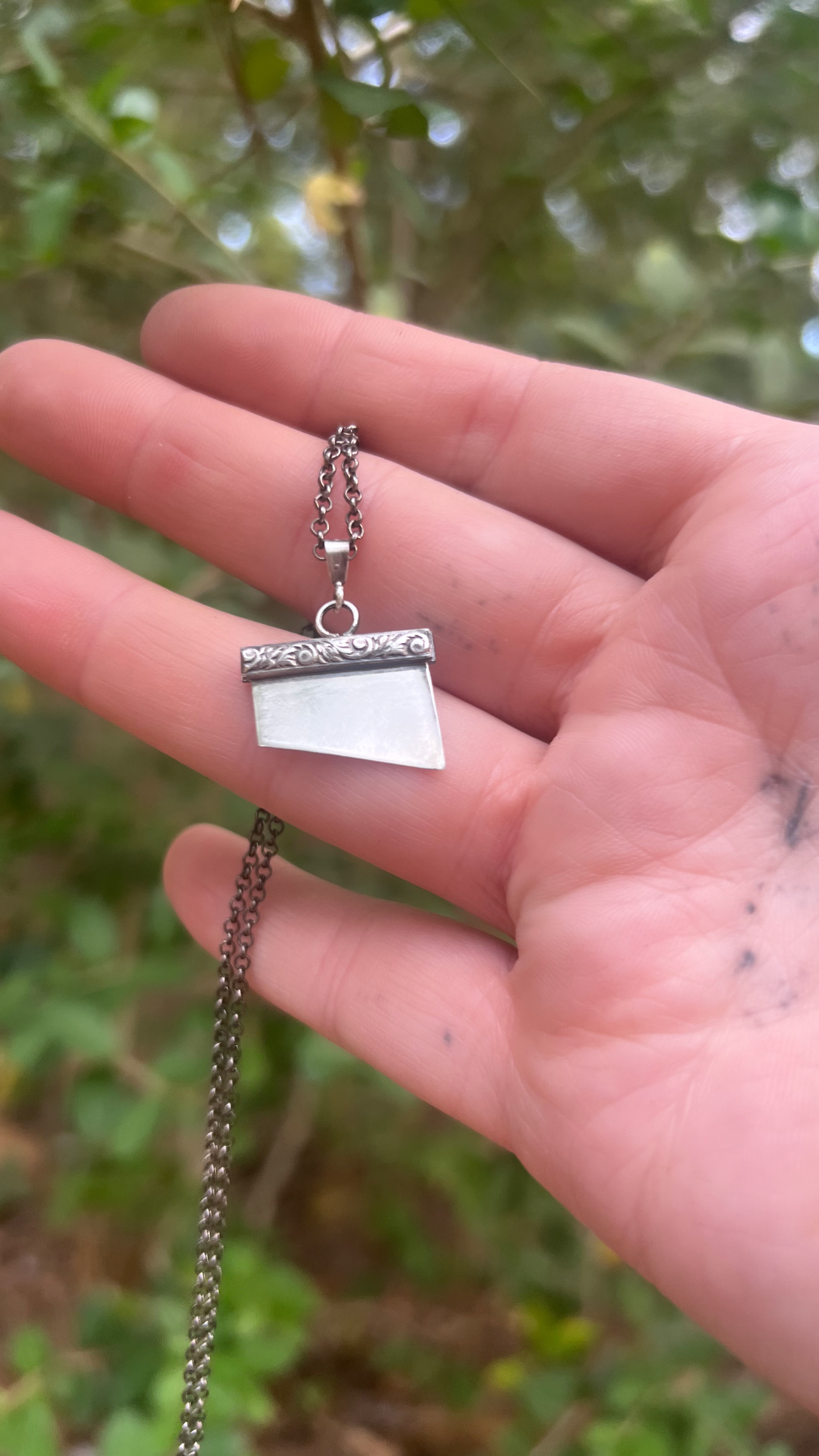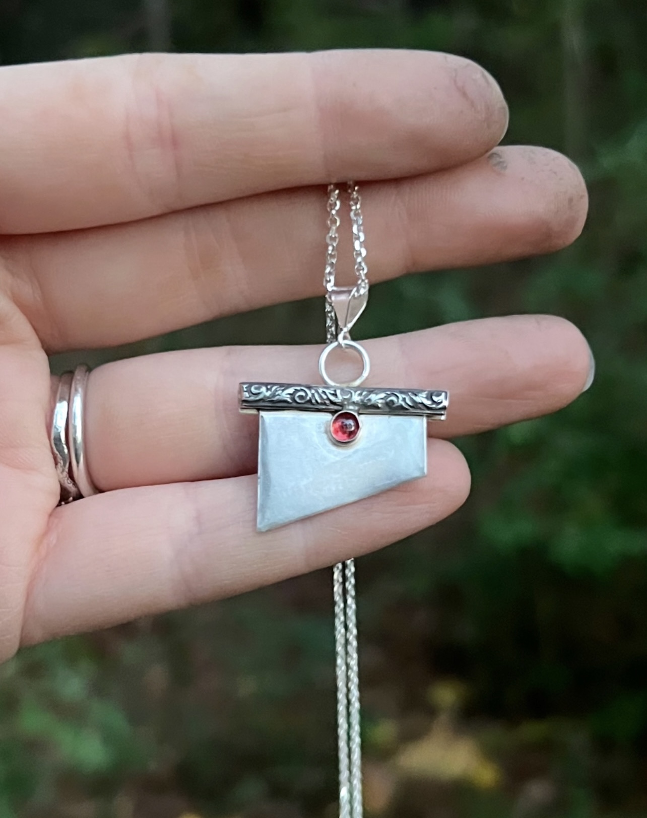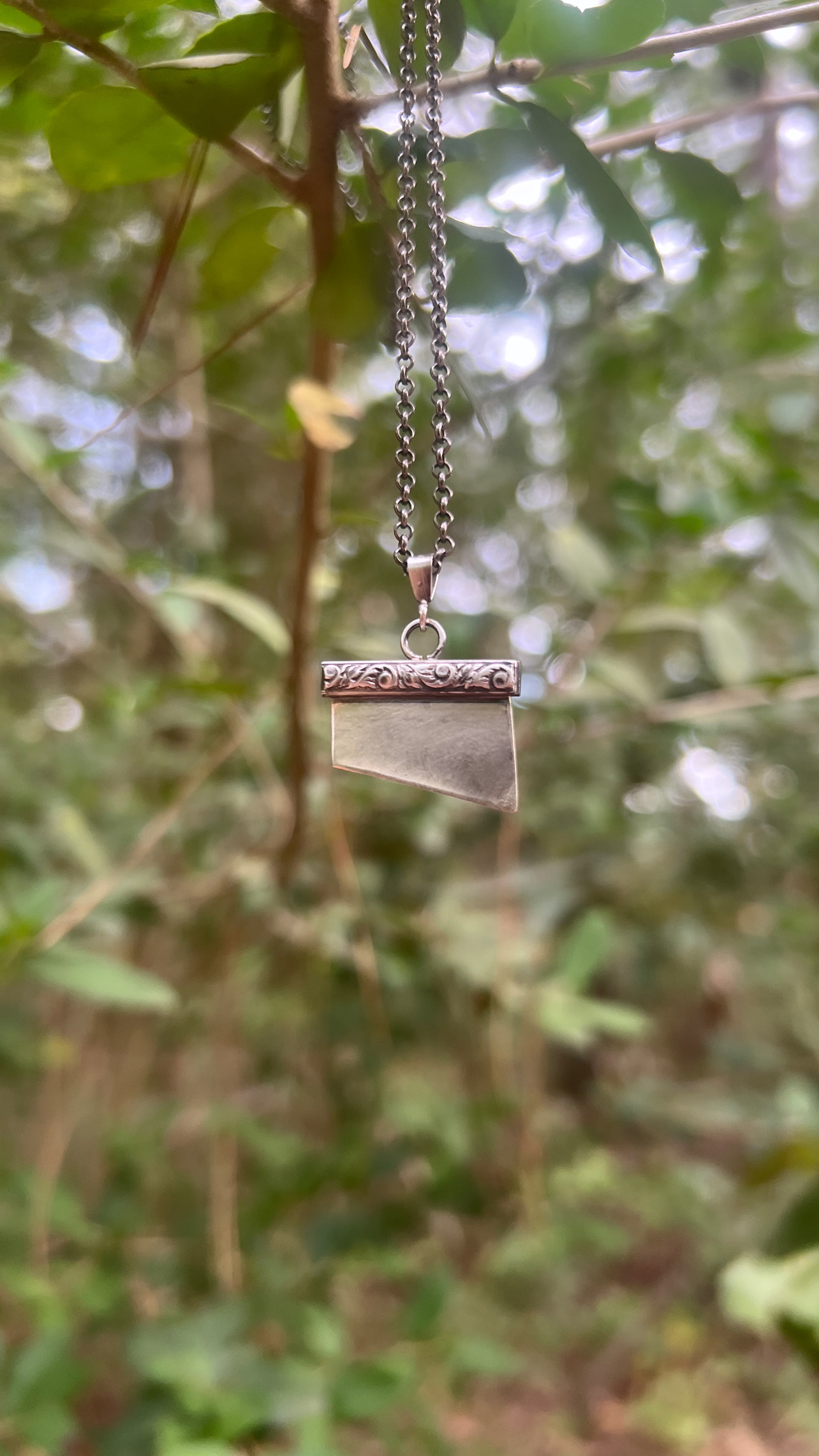 All sterling silver hand crafted guillotine blade on a 16 inch rolo oxidized chain.