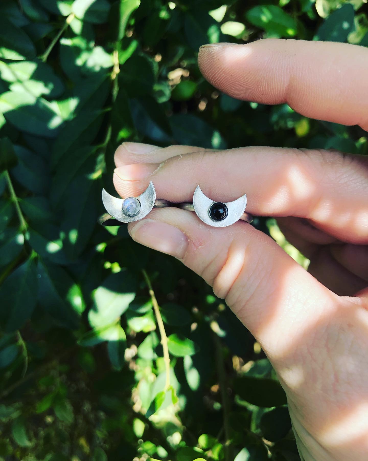 Sterling silver crescent rings, featuring gemstones. Made to order
