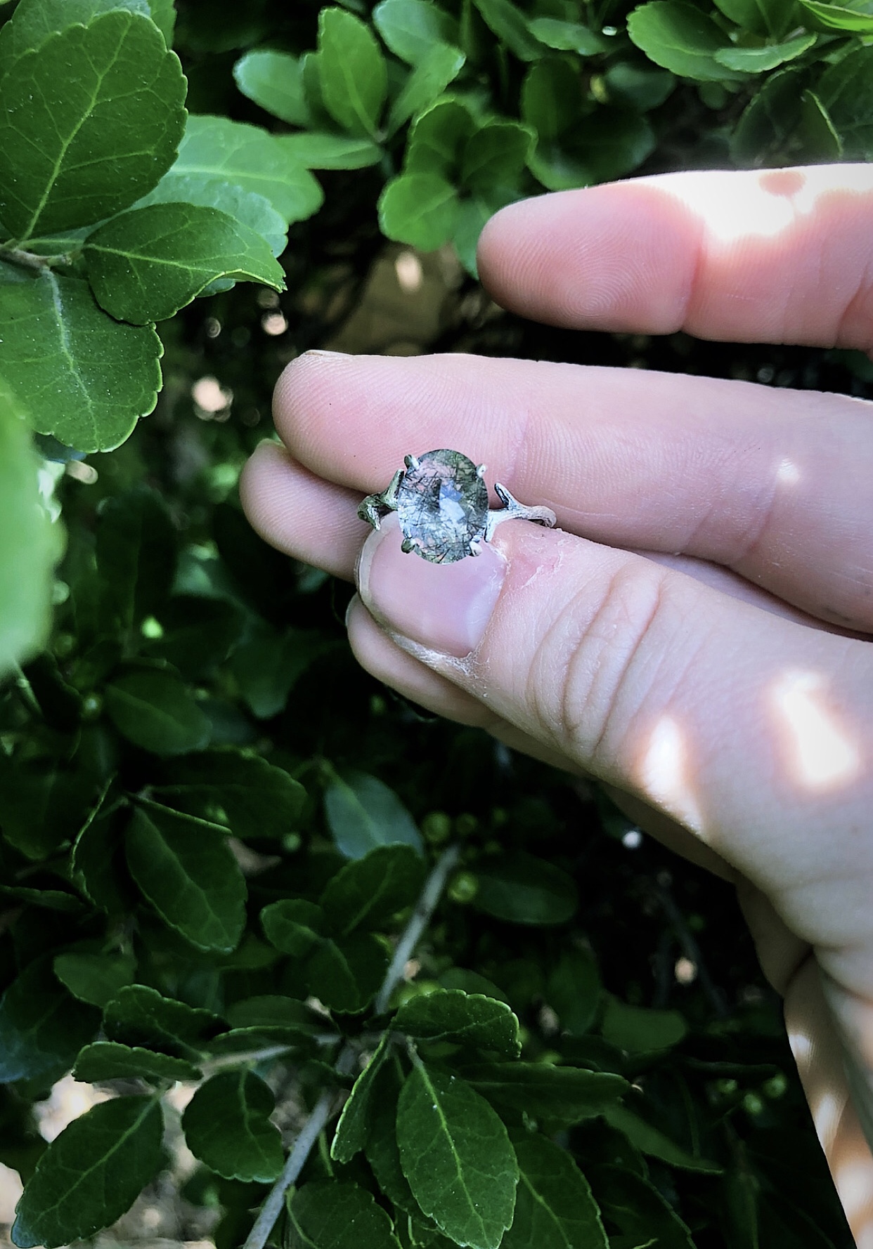 Prong setting twig and branch ring, with a Rutilated Quartz faceted stone. Size 6.5