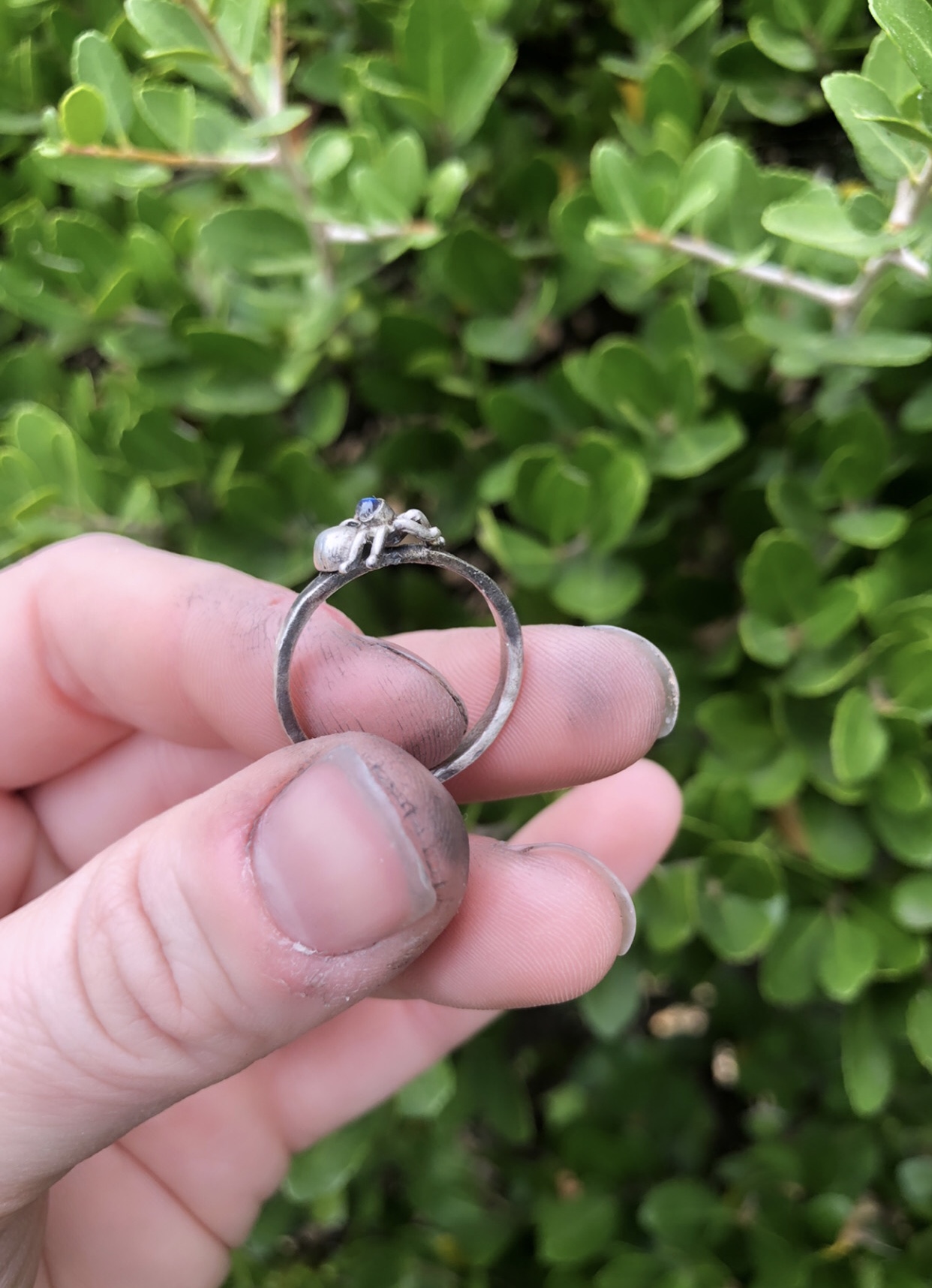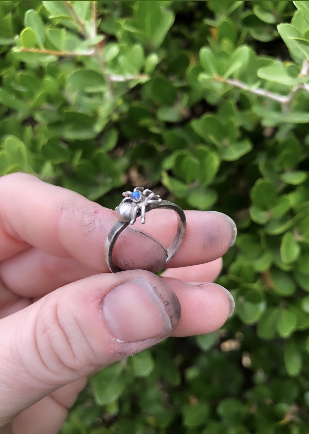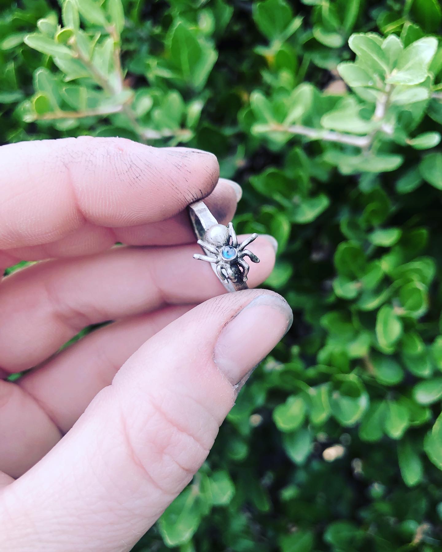 Hammered sterling silver ring, featuring a spider carrying a moon stone.