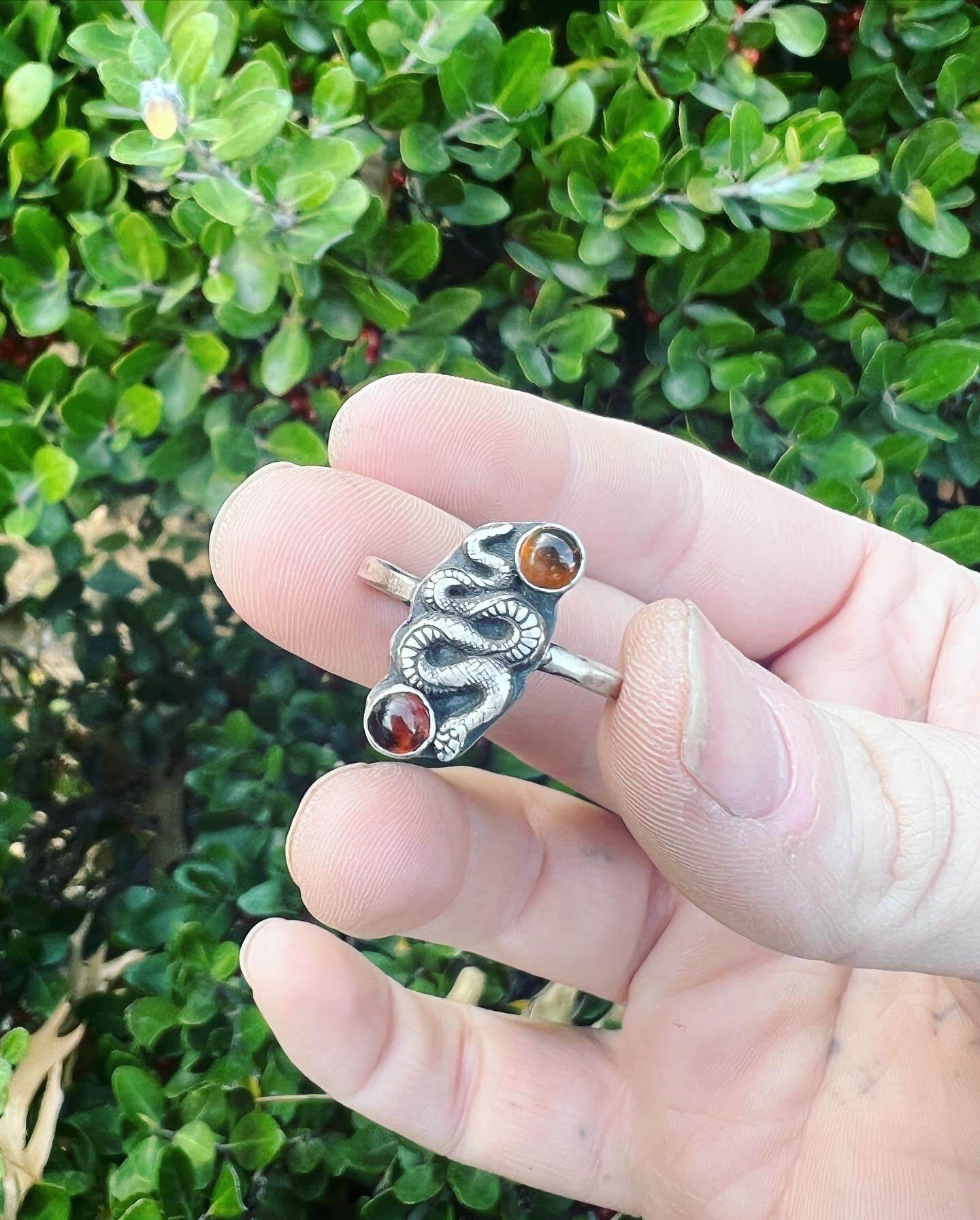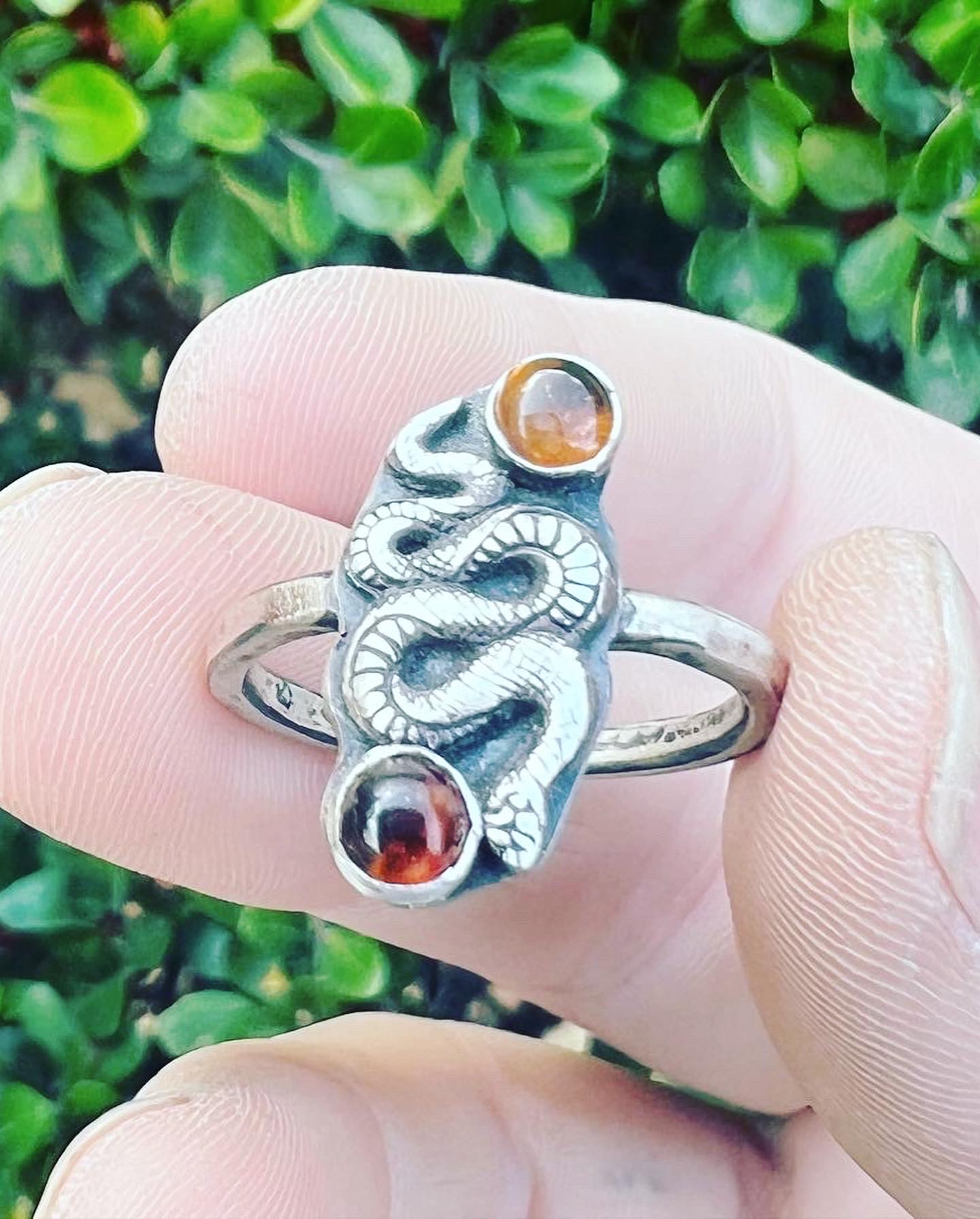 Sterling silver hammered ring with a sterling snake, and 2 bezel set amber stones.