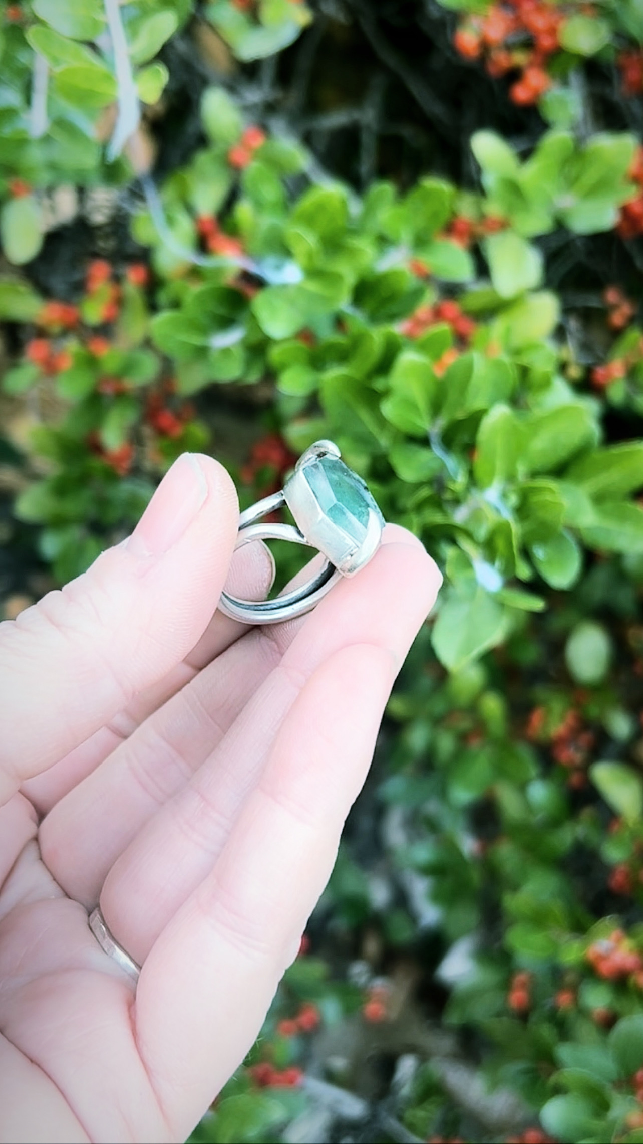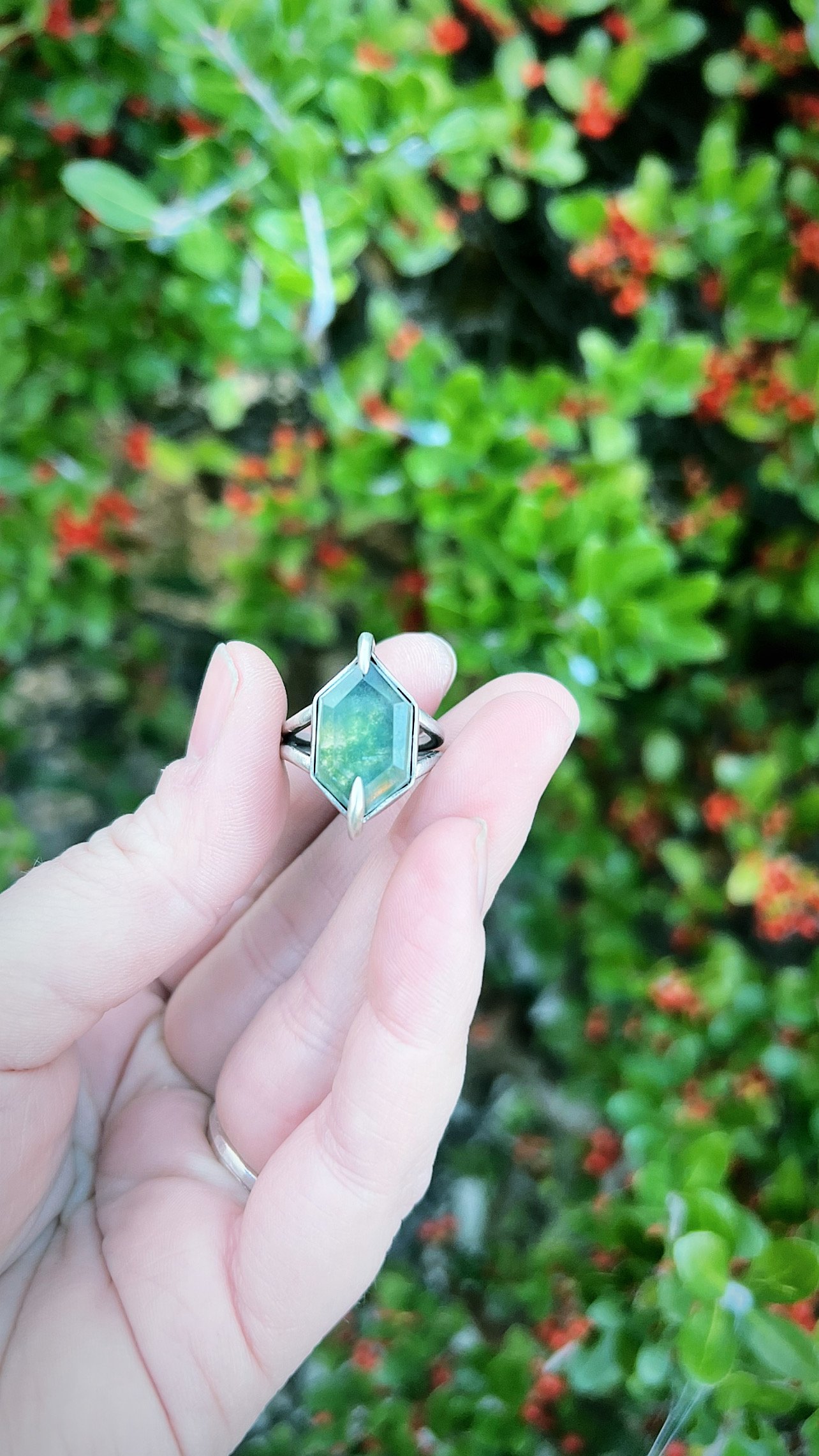 Hexagon moss agate doublet sitting in a claw prong setting on a double split setting. Size 6.5