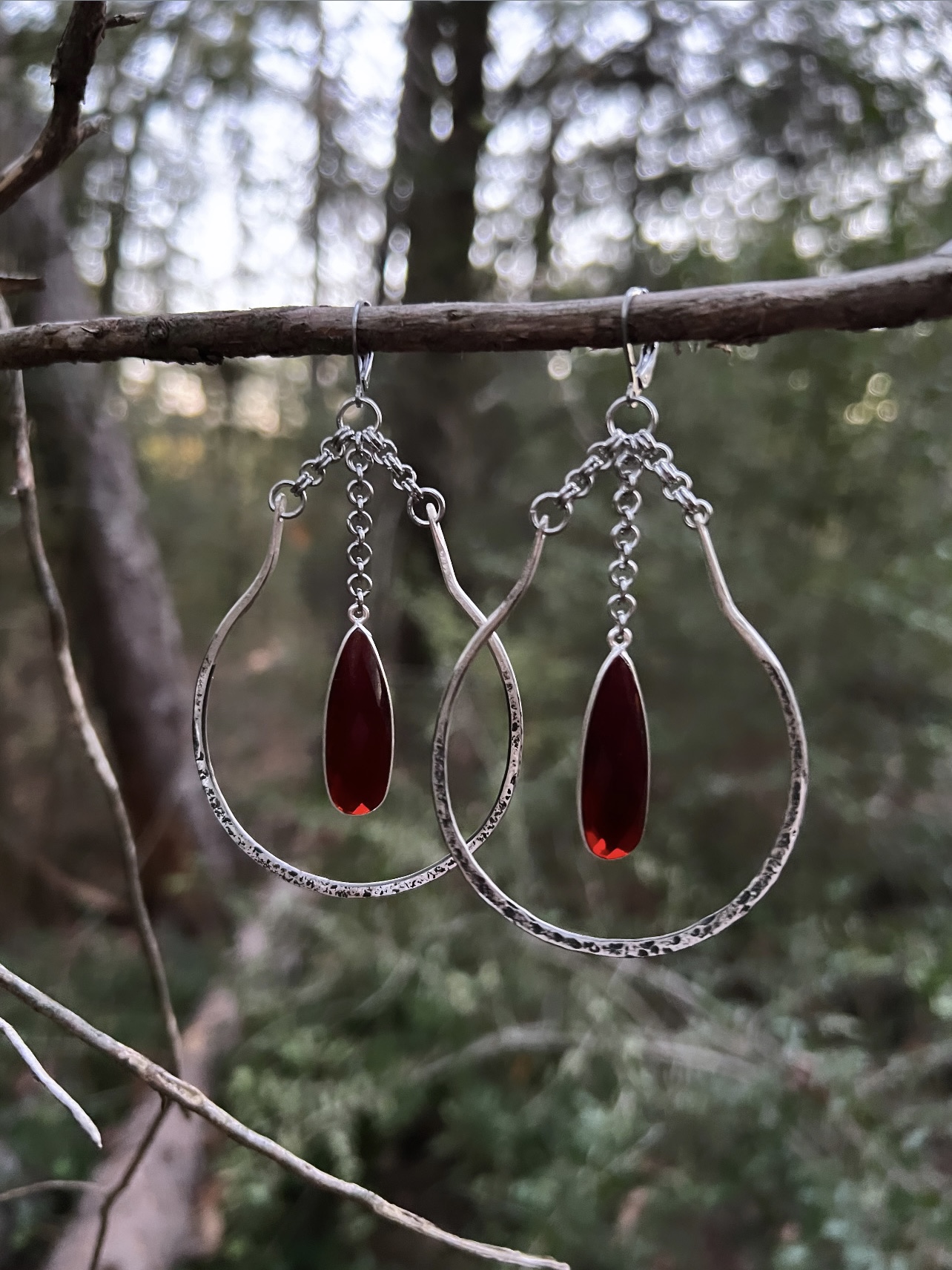 tear drop garnets between 3 inch hoops, with stainless steel rings and lever back earring hooks.