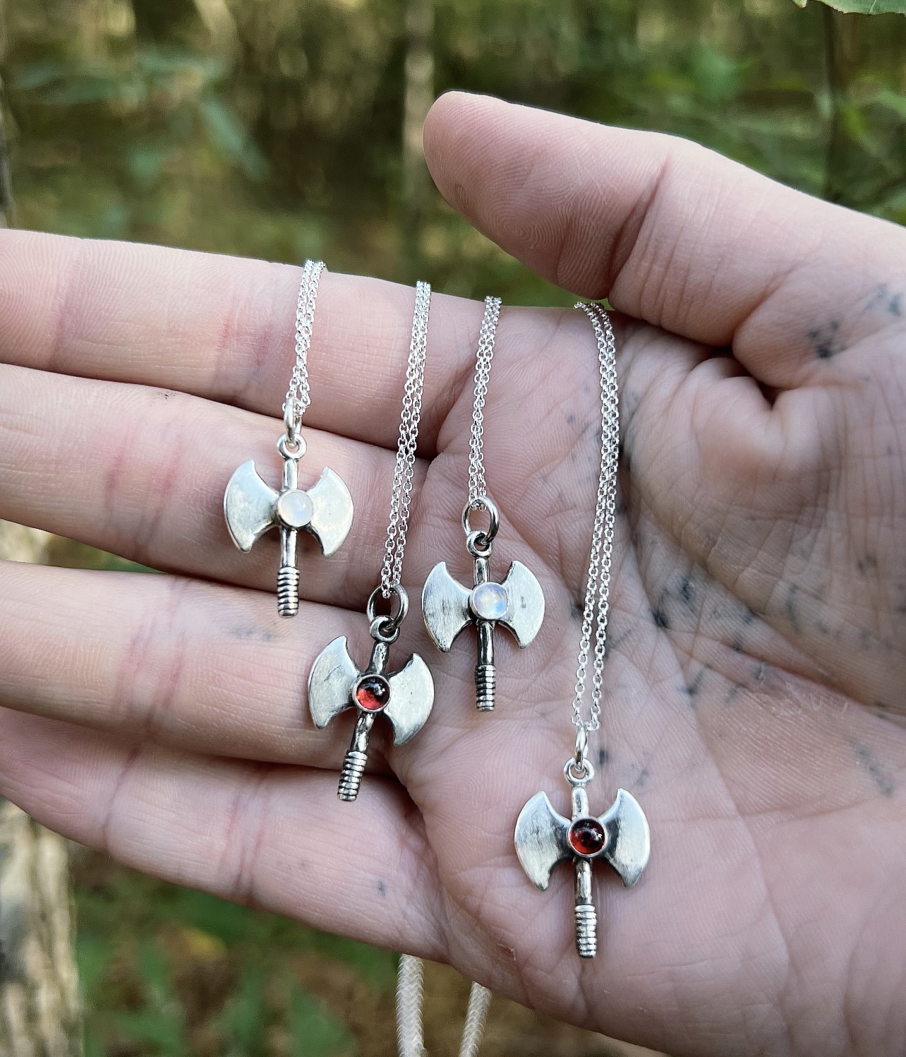 Sterling silver axe pendant with moonstone, or red garnet jewels.