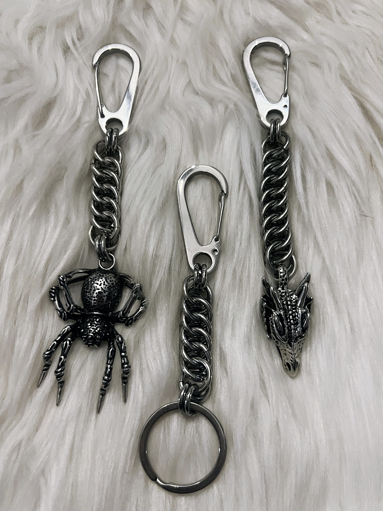 Stainless steel carabiner with chainmaille and your choice of spider, dragon, or plain keyring.