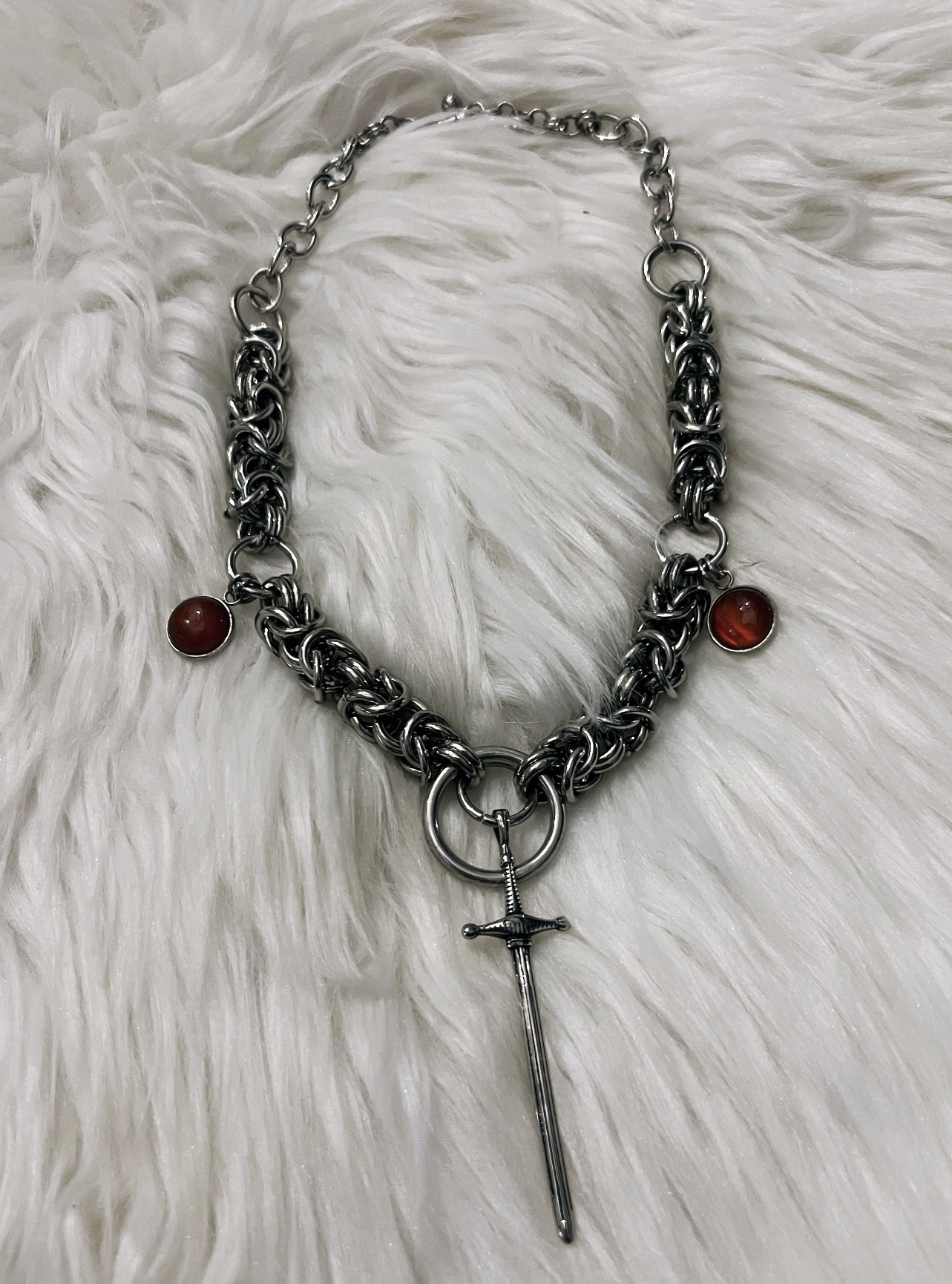 Large 18 inch chainmaille necklace featuring red jasper stones and a large sword.
