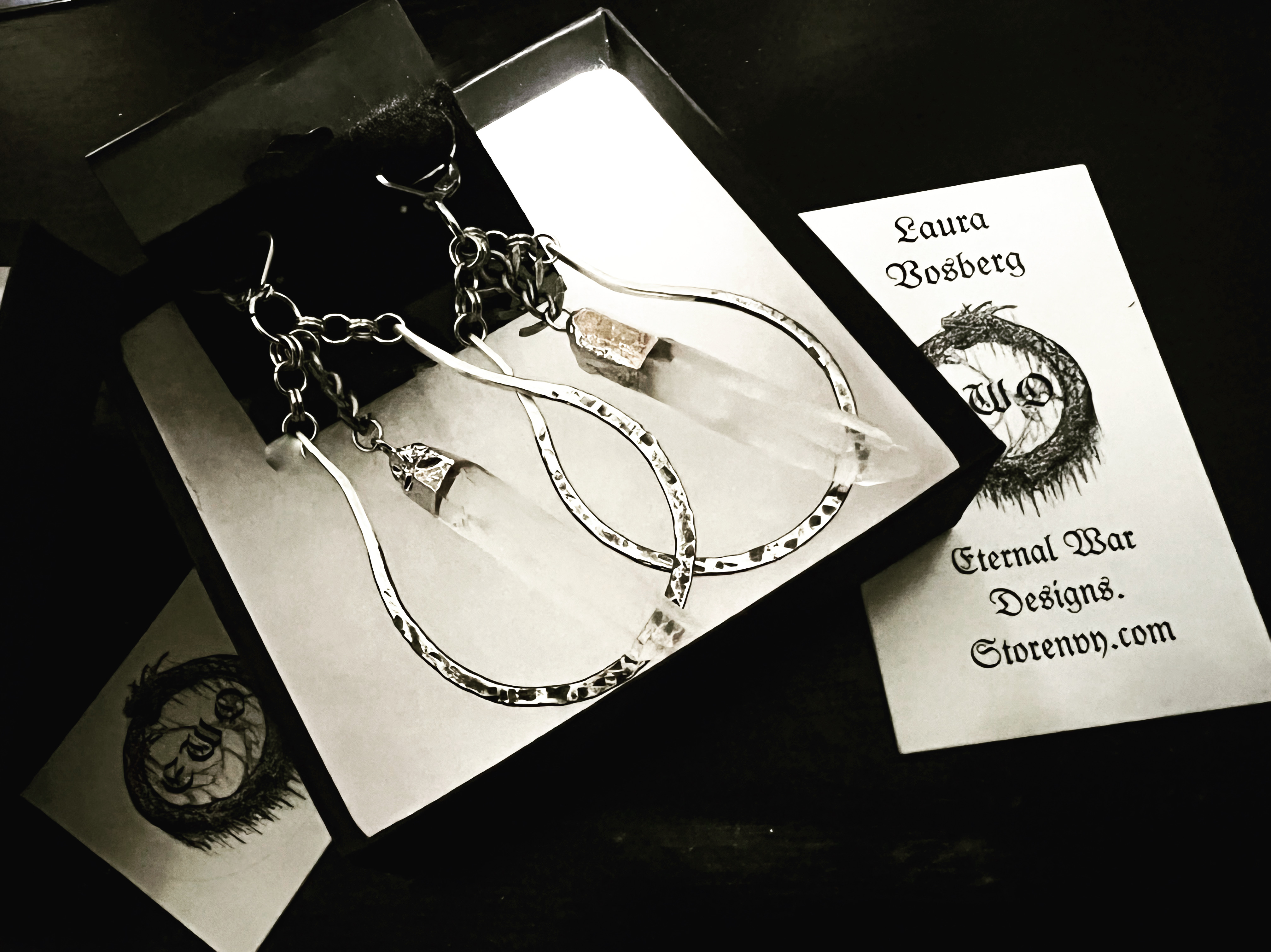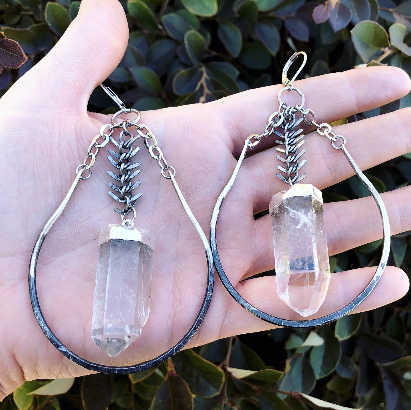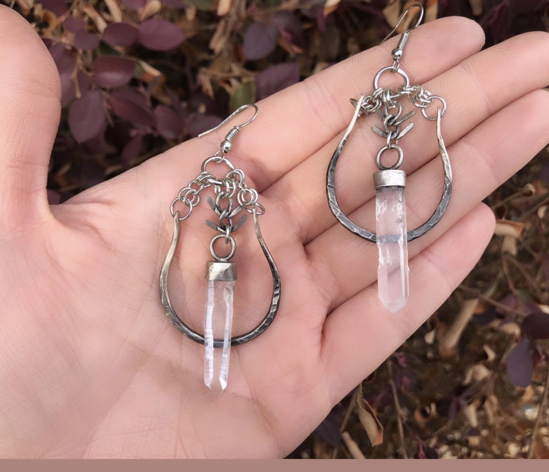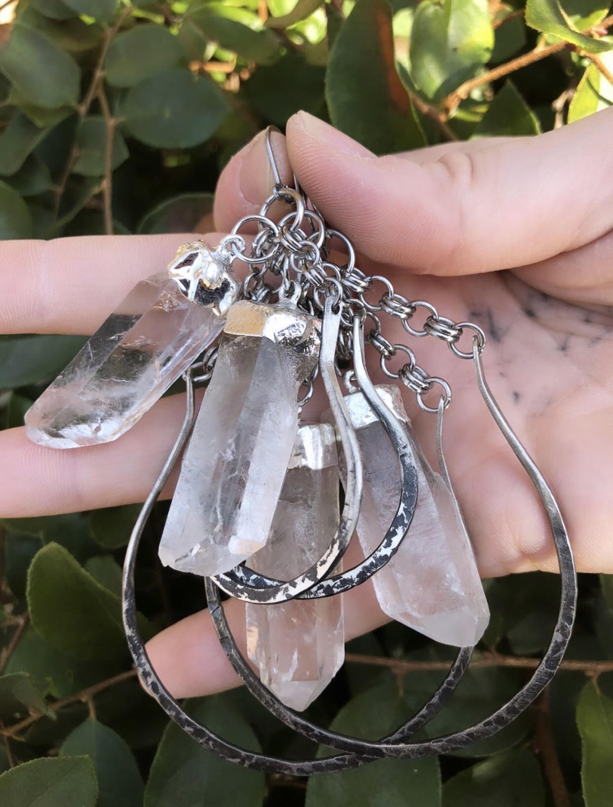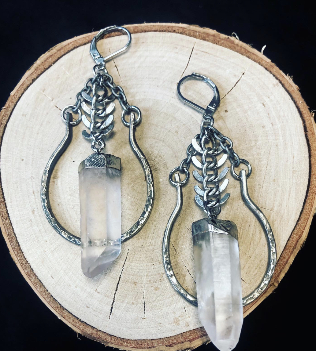 Hand hammered sterling silver 1 inch hoop, featuring clear quartz. Also available in a larger 3 inch hoop option, below