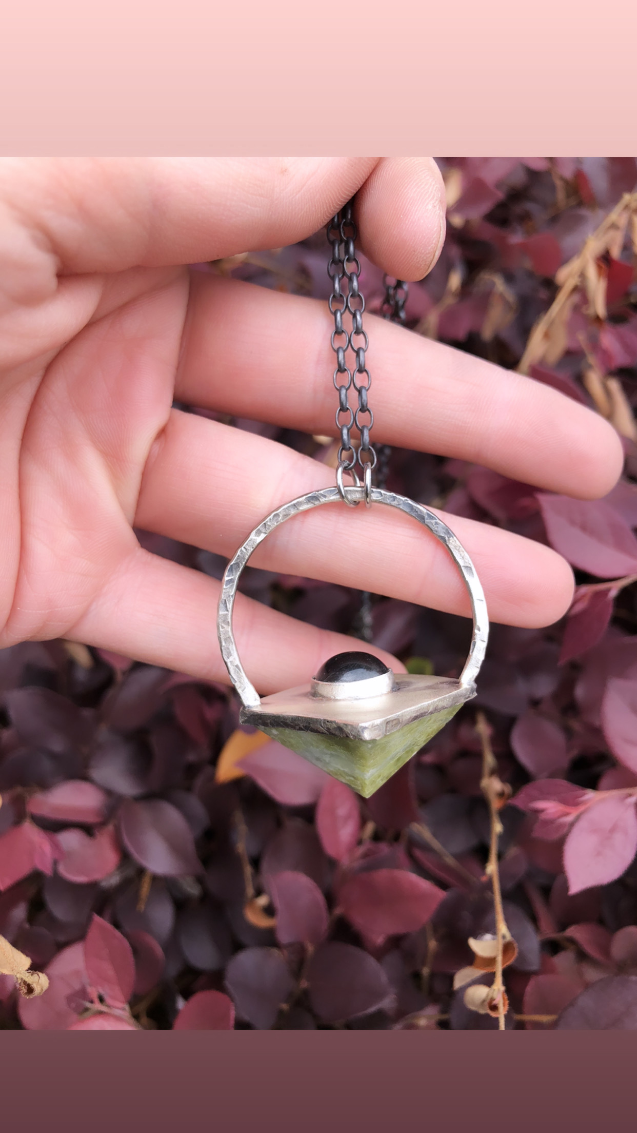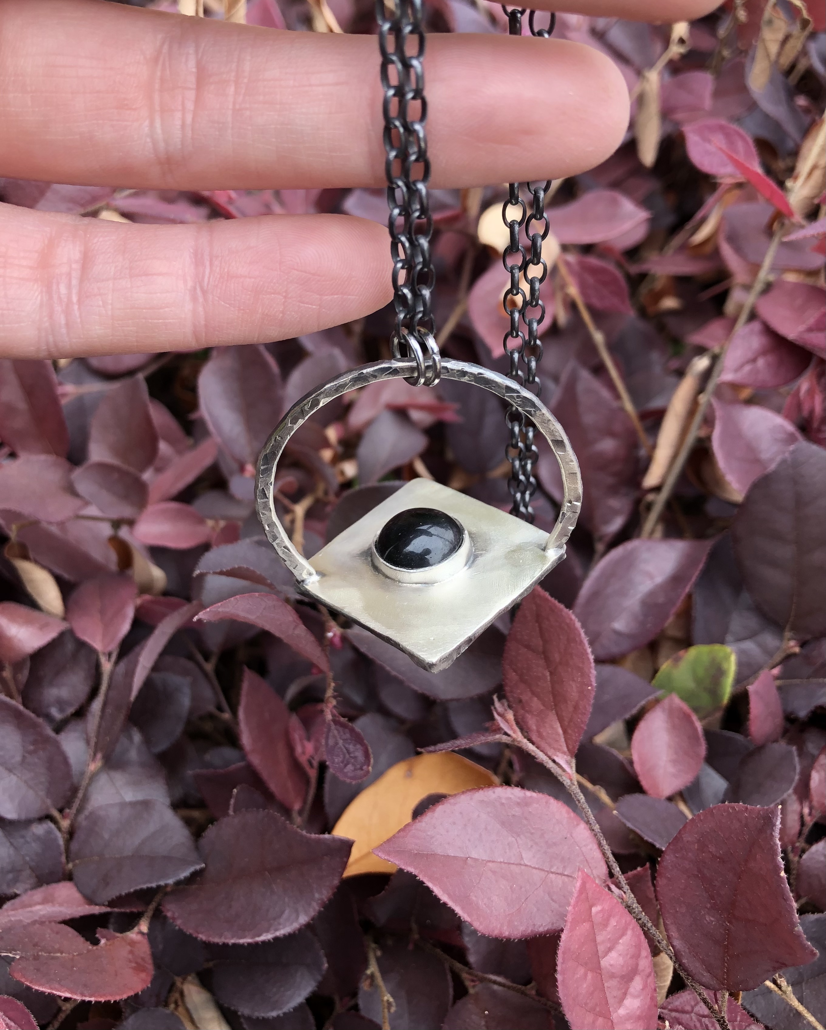 Vesuvianite pyramid pendant featuring a black onyx accent stone in a all sterling silver hammered hoop. On a 17” oxidized sterling silver chain.