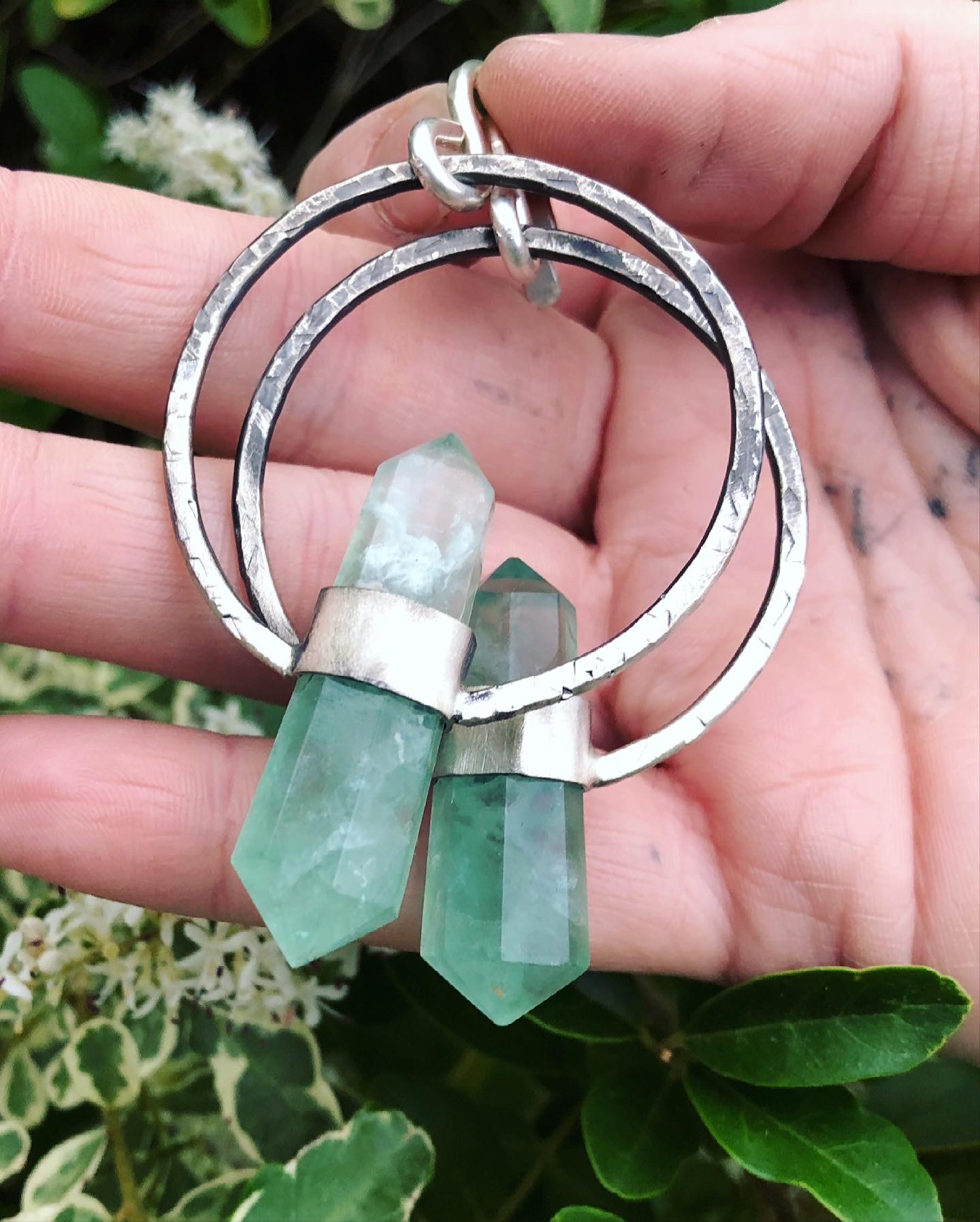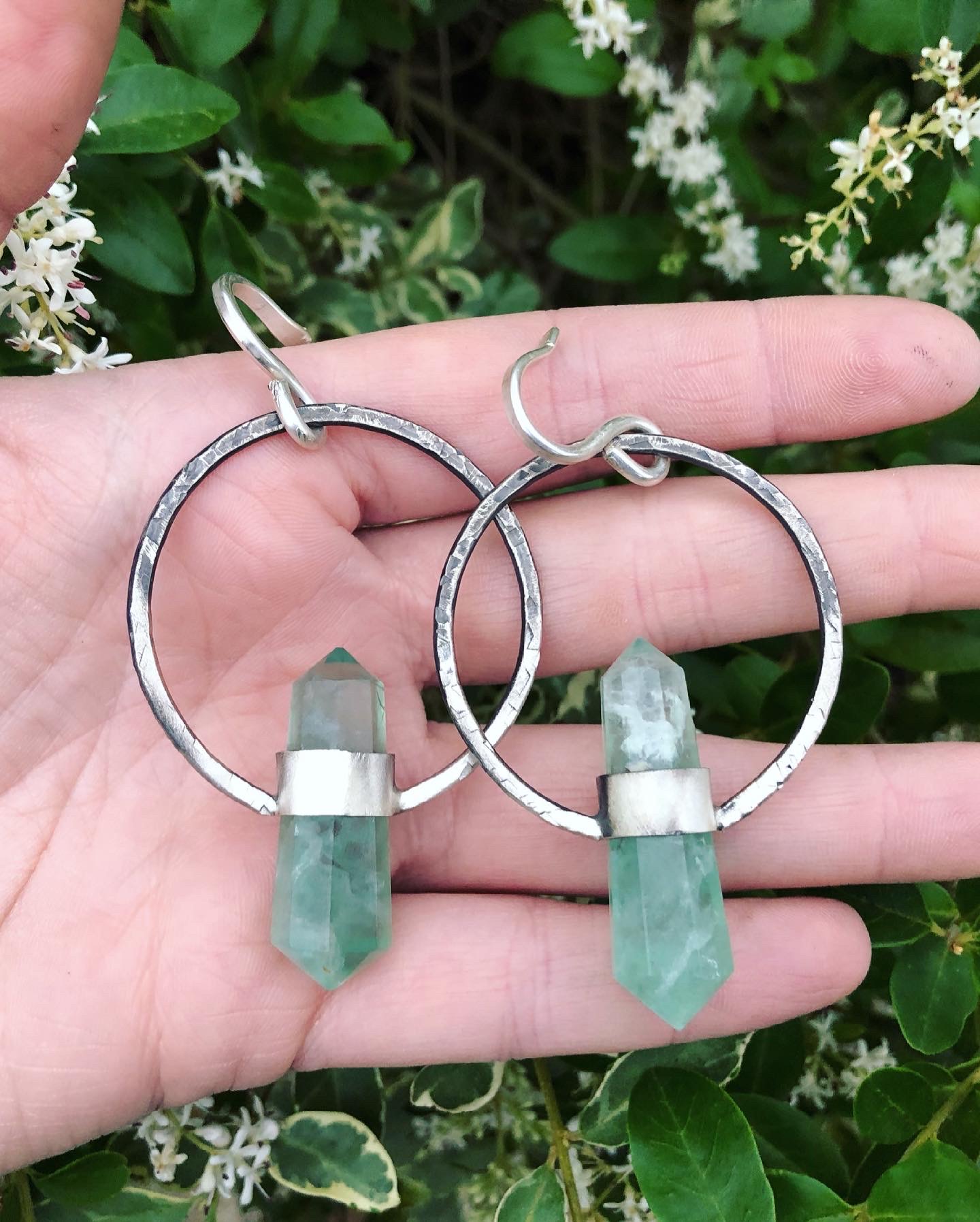 Green fluorite sterling silver hammered hoops, with 12g earring hooks. Can be made with regular hooks