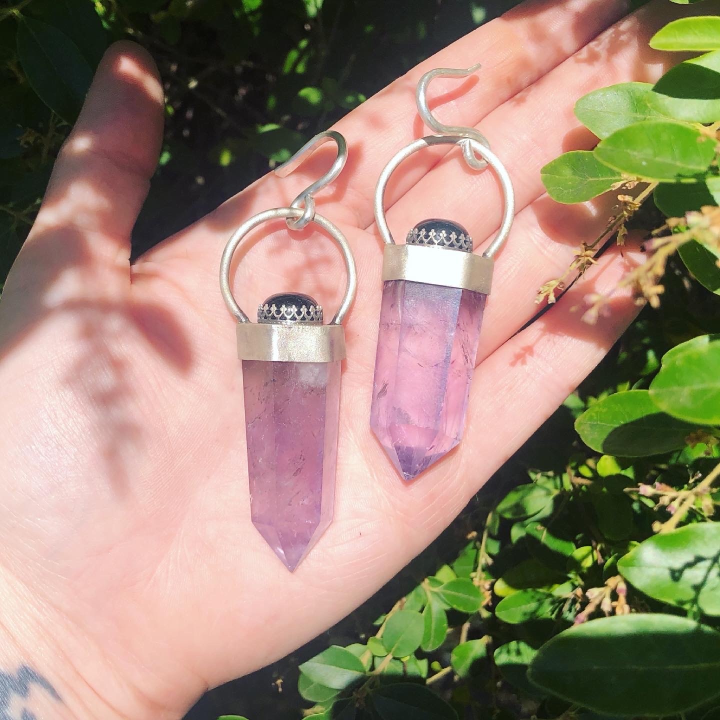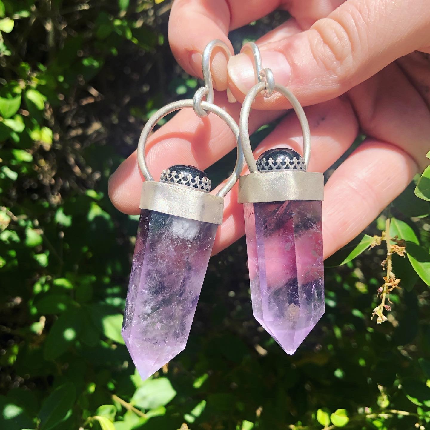 Sterling silver amethyst weights featuring a smaller black onyx stone cap. They are heavy and long! And also semi-translucent