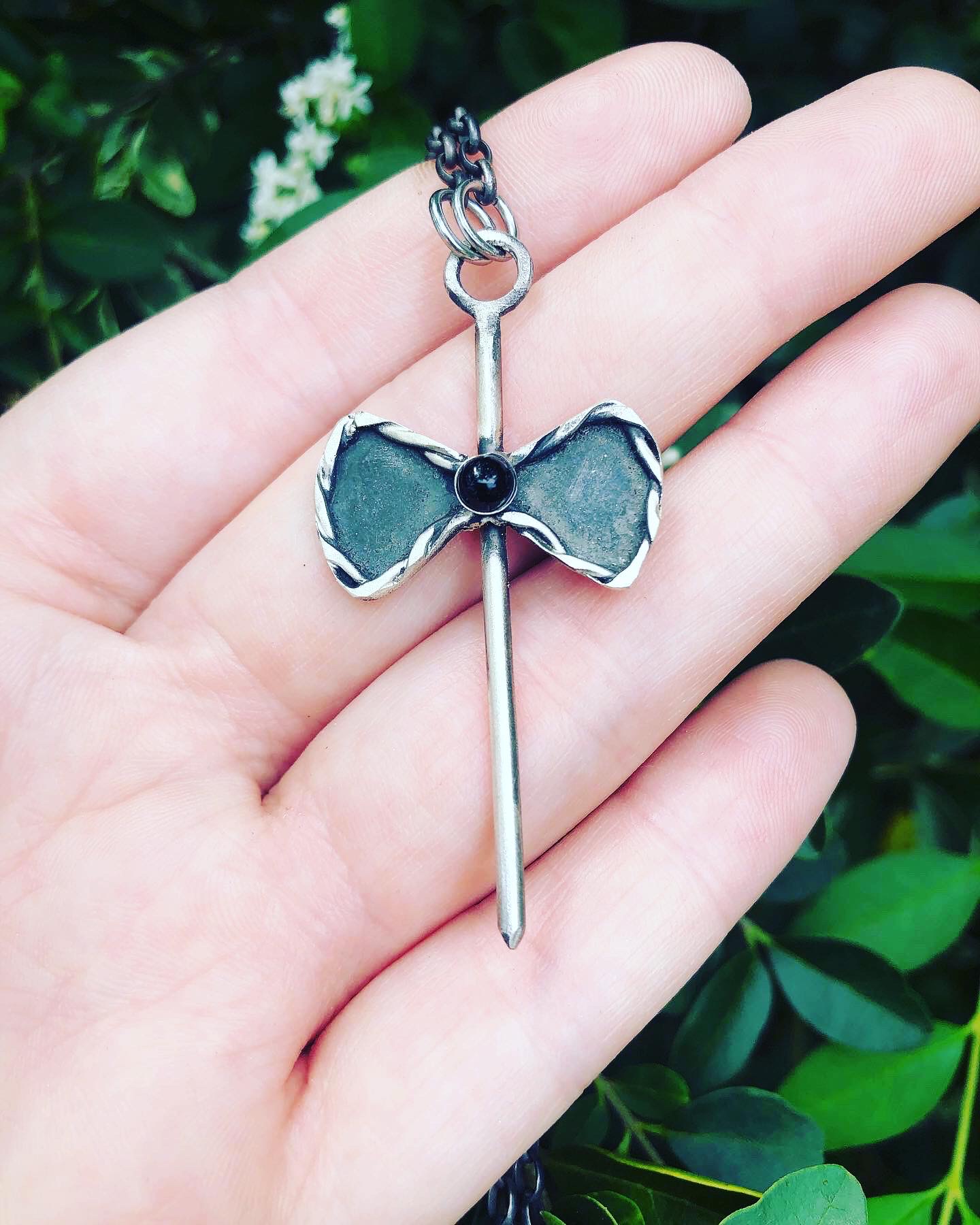 Completely hand forged sterling silver battle axe featuring a black onyx stone.