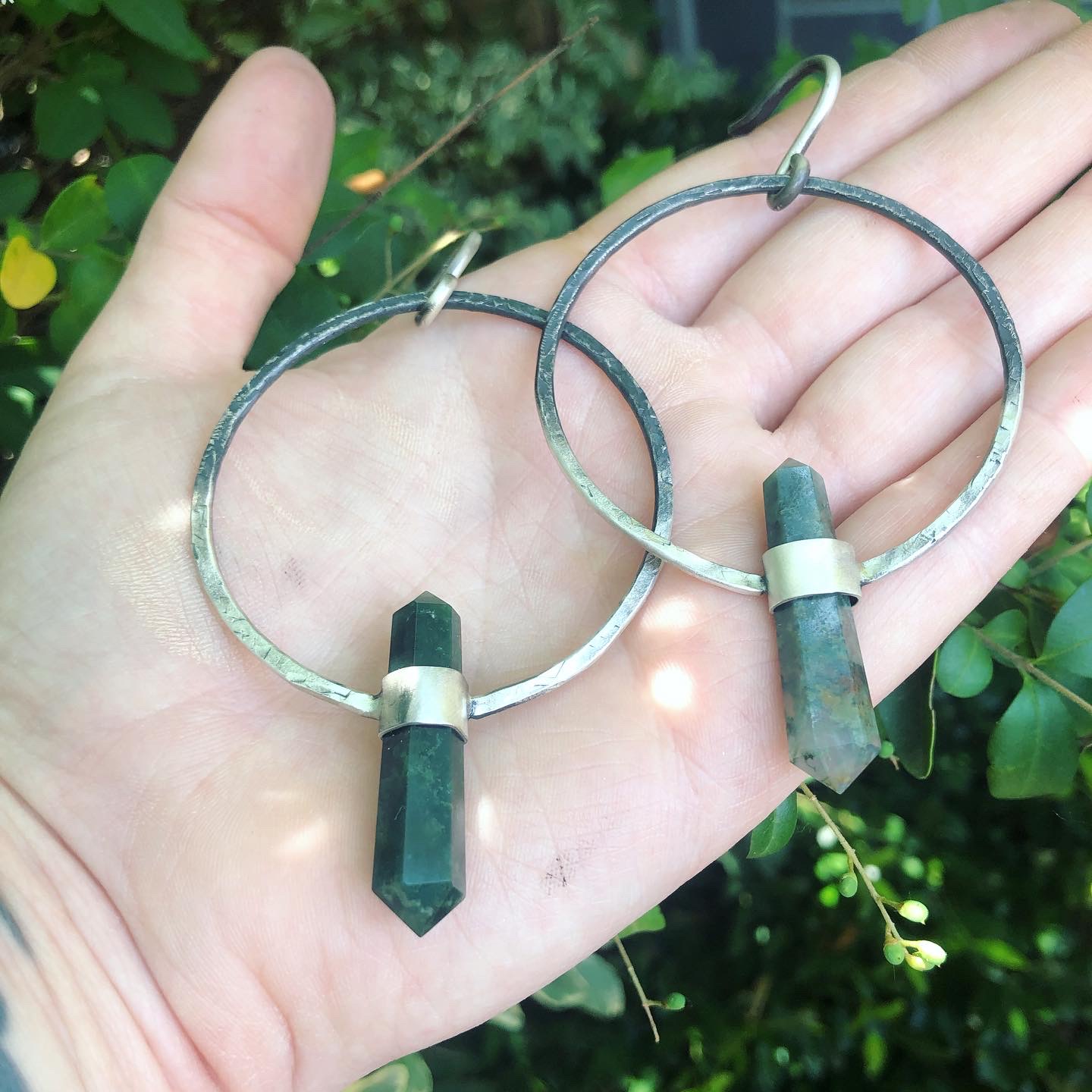 Large 2.5 inch all hammered sterling silver hoops with dark green moss agate crystals