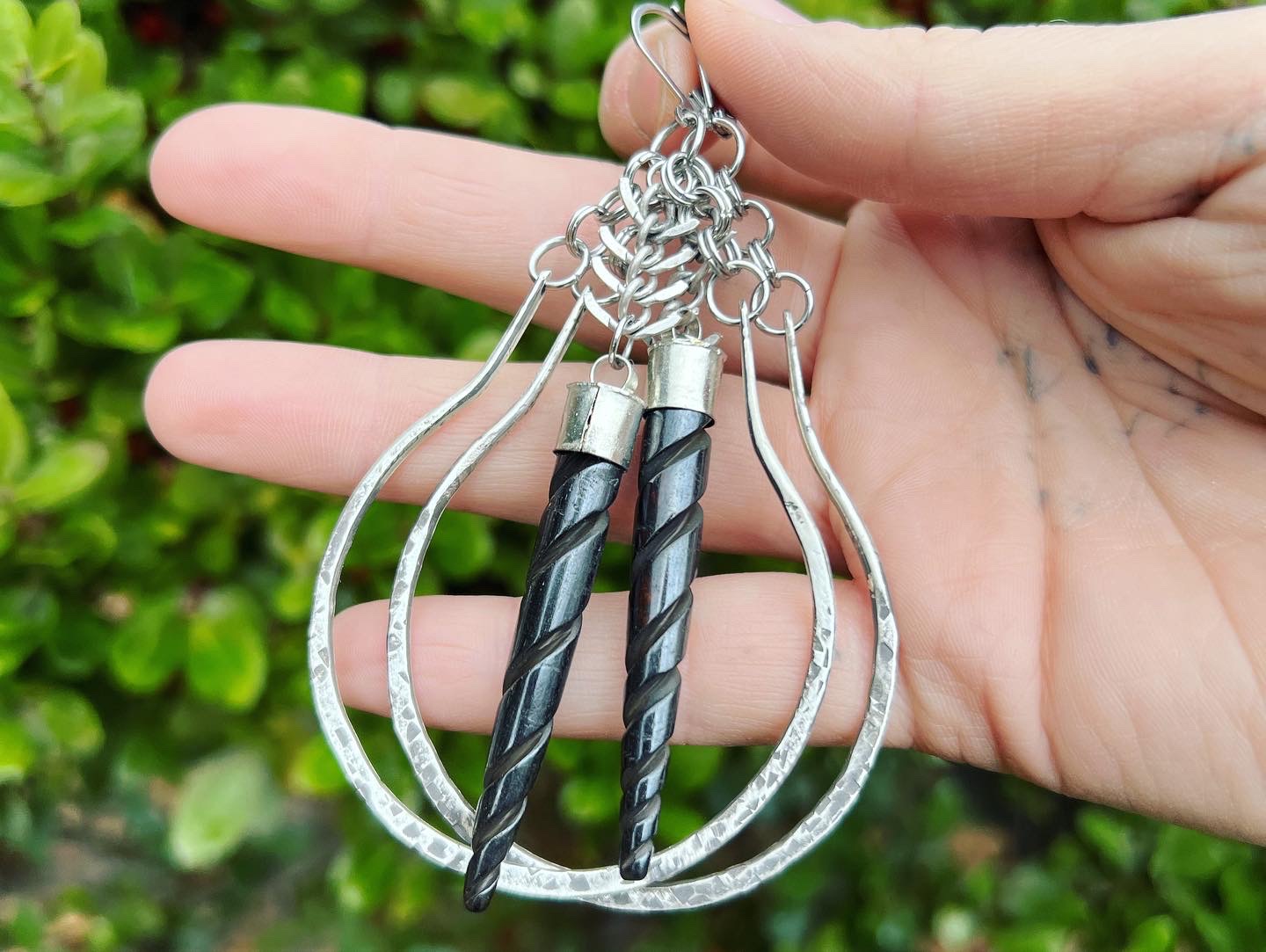 Large sterling silver hammered hoops featuring spiral capped horn. Comes with lever back earrings suitable for stretched or non stretched ears.