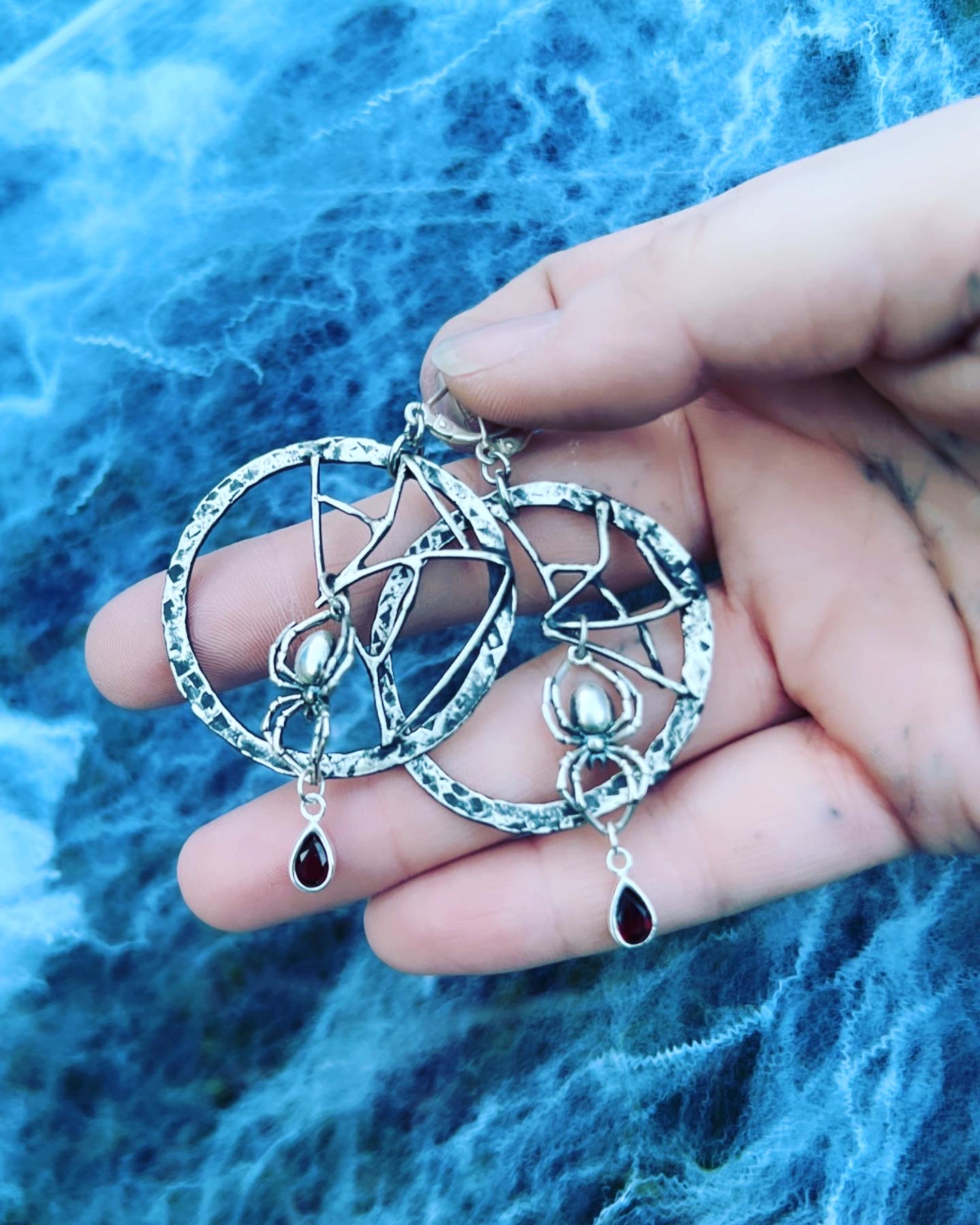 Hand fabricated sterling silver spider web hoops, featuring sterling silver spiders and teardrop garnets.