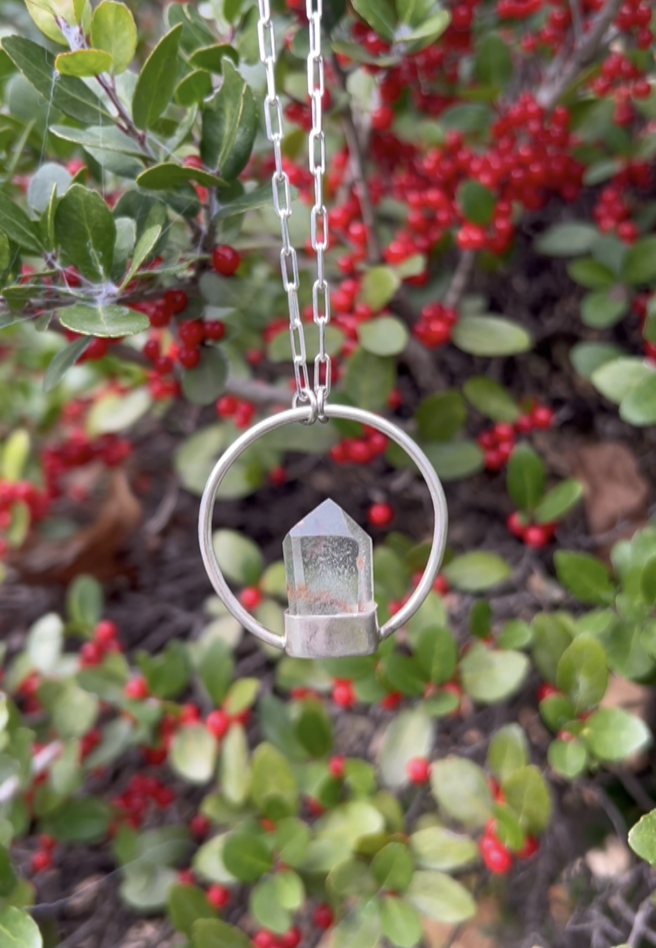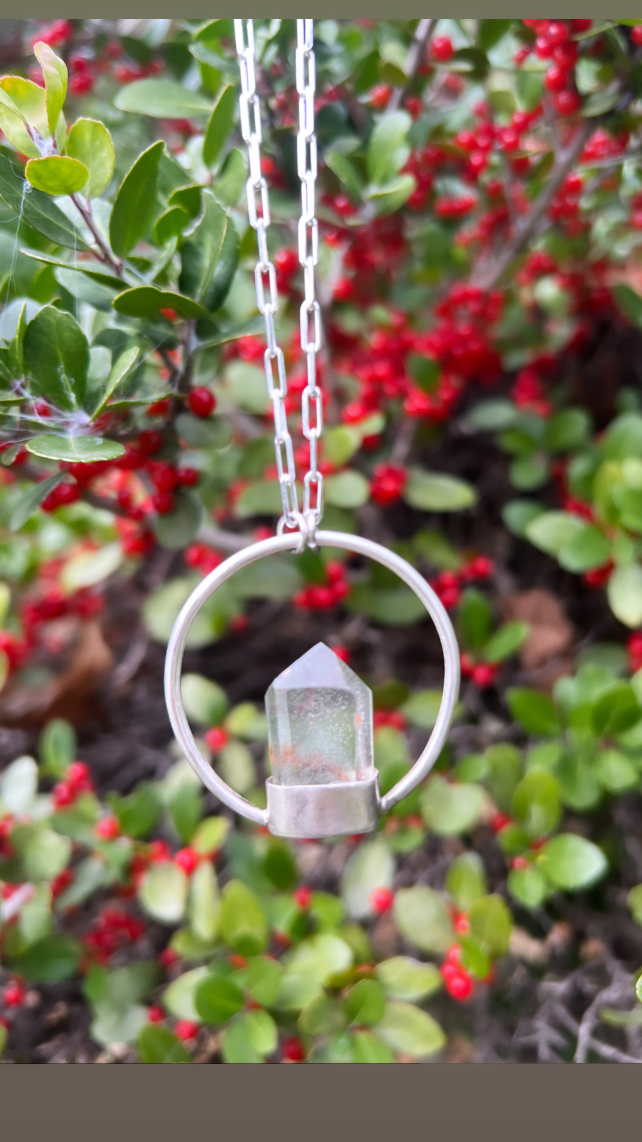 Quartz crystal with small red inclusions set in a candle sterling silver setting with a large sterling silver hoop on a 18 inch sterling silver chain.