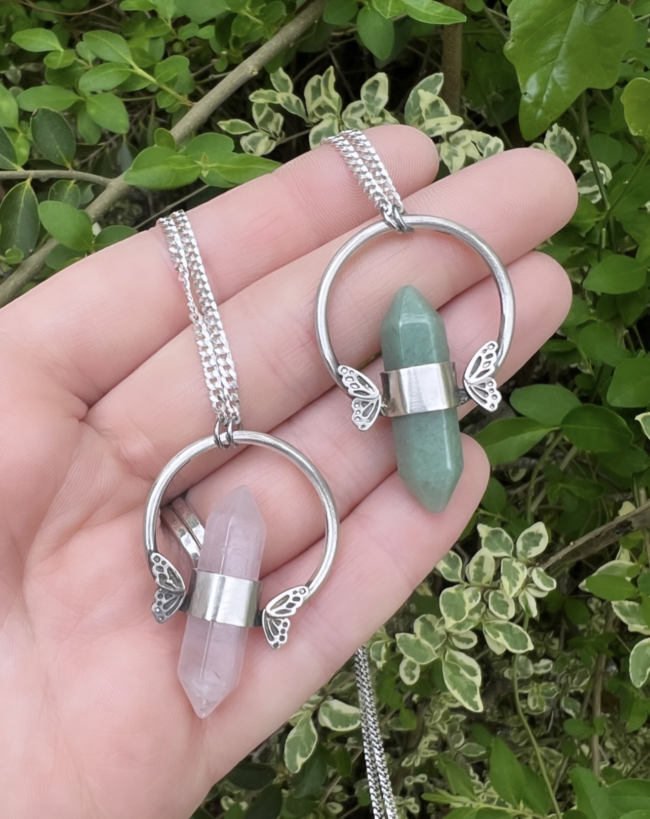 Super cute sterling silver 1 inch hoops featuring butterfly wings and Rose Quartz or Amethyst point crystals.