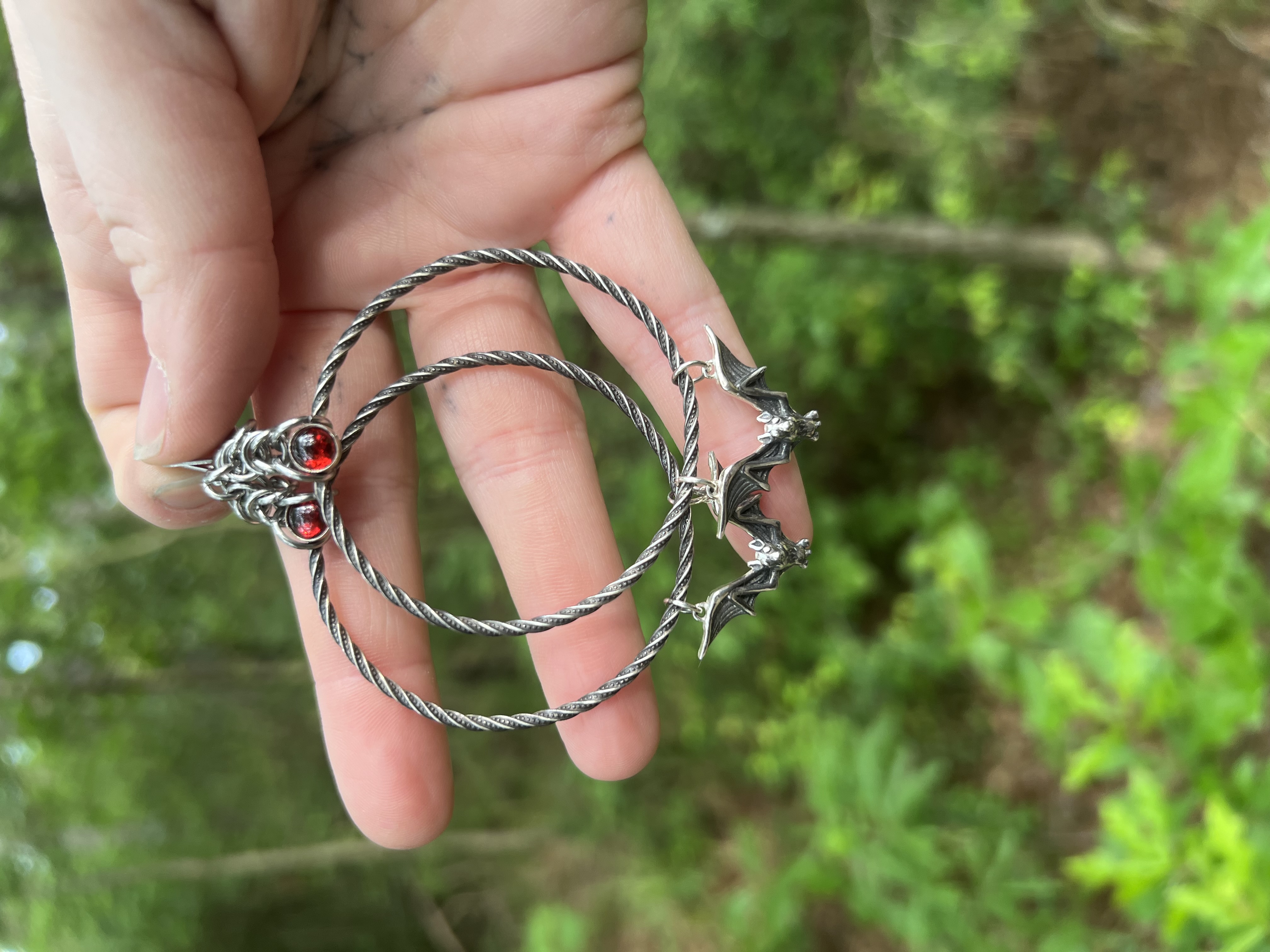 Sterling silver box hoops with hanging bats and a garnet stone in a chainmail weave.